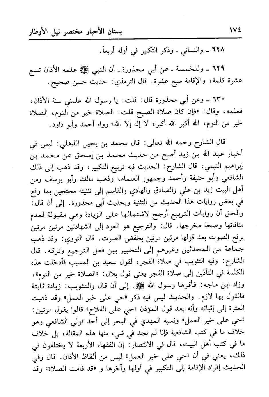 لِعَدَمِ مُنَافَاتِهَا وَصِحَّةِ مَخْرَجِهَا. قال: وَالتَّرْجِيعُ هُوَ الْعَوْدُ إلَى الشَّهَادَتَيْنِ مَرَّتَيْنِ مَرَّتَيْنِ بِرَفْعِ الصَّوْتِ بَعْدَ قَوْلِهَا مَرَّتَيْنِ مَرَّتَيْنِ بِخَفْضِ الصَّوْتِ. قال النووي: وقد ذهب جماعة من المحدثين وغيرهم إلى التخيير بين فعل الترجيح وتركه. قال الشارح: وفيه لتثويب في صلاة الفجر، لقول سعيد بن المسيب فأدخلت هذه الكلمة في التأذين إلى صلاة الفجر يعني قول بلال: (الصلاة خير من النوم) وزاد ابن ماجة: فأقرها رسول الله - صلى الله عليه وسلم - إلى أن قال: والتثويب زيادة ثابتة فالقول بها لازم. والحديث ليس فيه ذكر (حي على خير العمل) وقد ذهبت العترة إلى إثباتها وأنه بعد قول المؤذن (حي على الفلاح) قالوا: يقول مرتين: (حي على خير العمل) ونسبه المهدي في البحر إلى أحد قولي الشافعي وهو خلاف ما في كتب الشافعية فإنا لم نجد في شيء منها هه المقالة بل خلاف ما في كتب أهل البيت. قال في الانتصار: إن الفقهاء الأربعة لا يختلفون في ذلك يعني في أن (حي على خير العمل) ليس من ألفاظ الأذان. قال: وفي الحديث إفراد الإقامة إلى التكبير في أولها وآخرها و (قد قامت الصلاة) وقد