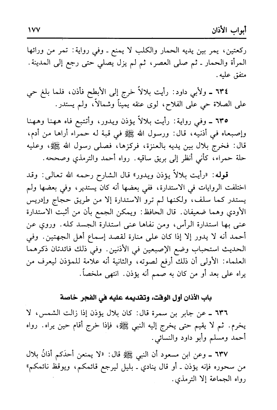 634- وَلِأَبِي دَاوُد: رَأَيْت بِلَالًا خَرَجَ إلَى الْأَبْطَحِ فَأَذَّنَ فَلَمَّا بَلَغَ حَيَّ عَلَى الصَّلَاةِ حَيَّ عَلَى الْفَلَاحِ لَوَى عُنُقَهُ يَمِينًا وَشِمَالًا وَلَمْ يَسْتَدِرْ.