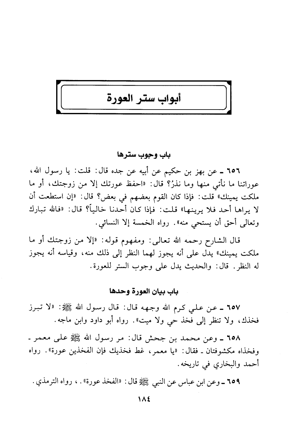 656- عَنْ بَهْزِ بْنِ حَكِيمٍ عَنْ أَبِيهِ عَنْ جَدِّهِ قَالَ: قُلْت: يَا رَسُولَ اللَّهِ عَوْرَاتُنَا مَا نَأْتِي مِنْهَا وَمَا نَذَرُ؟ قَالَ: «احْفَظْ عَوْرَتَك إلَّا مِنْ زَوْجَتِك أَوْ مَا مَلَكَتْ يَمِينُك» . قُلْت: فَإِذَا كَانَ الْقَوْمُ بَعْضُهُمْ فِي بَعْضٍ؟ قَالَ: «إنْ اسْتَطَعْت أَنْ لَا يَرَاهَا أَحَدٌ فَلَا يَرَيَنَّهَا» . قُلْت: فَإِذَا كَانَ أَحَدُنَا خَالِيًا؟ قَالَ: «فَاَللَّهُ تَبَارَكَ وَتَعَالَى أَحَقُّ أَنْ يُسْتَحْيَا مِنْهُ» . رَوَاهُ الْخَمْسَةُ إلَّا النَّسَائِيّ.