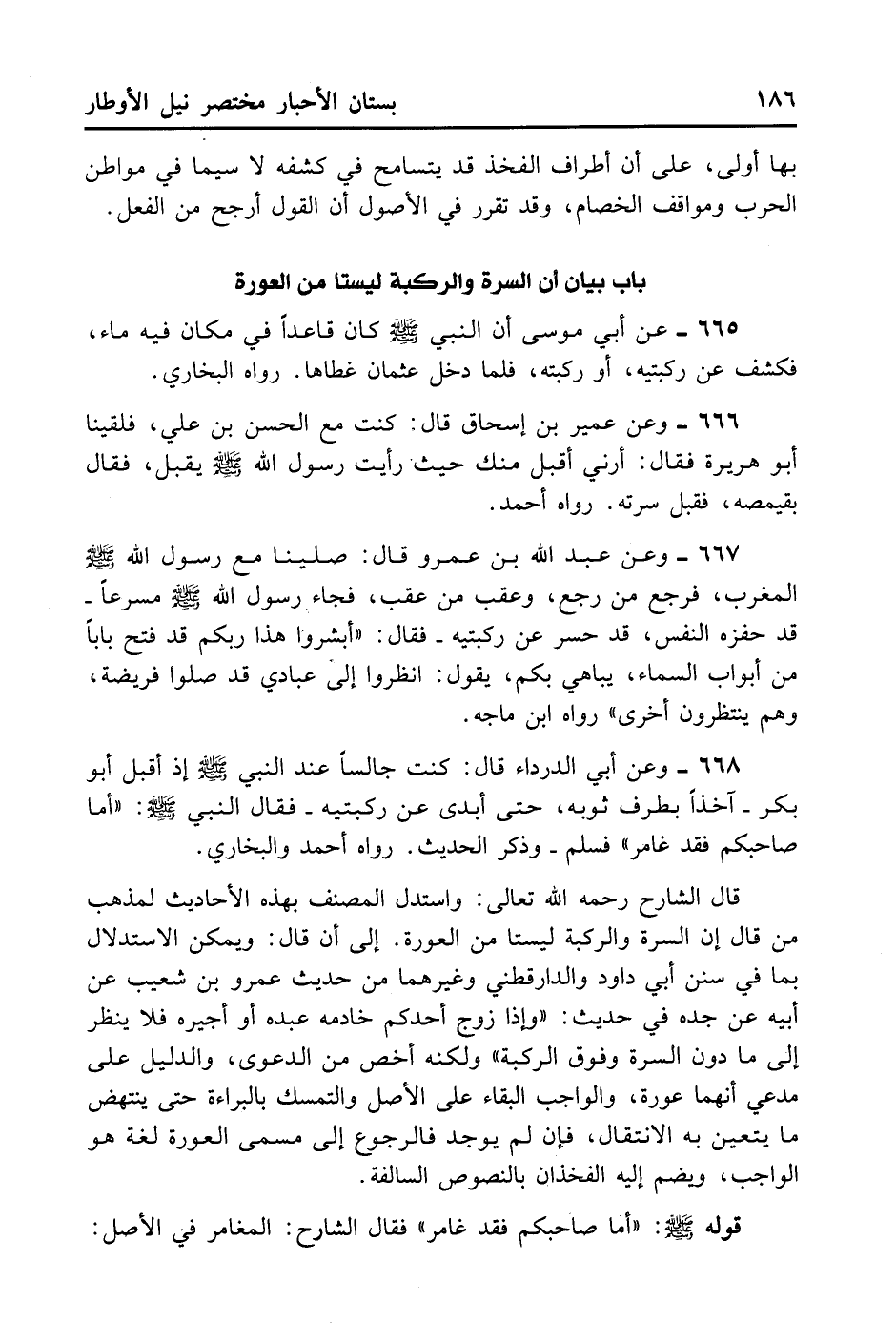 قَالَ الشَّارِحُ رَحِمَهُ اللَّهُ تَعَالَى: وَاسْتَدَلَّ الْمُصَنِّفُ بِهَذِهِ الْأحَادِيث لِمَذْهَبِ مَنْ قَالَ: إنَّ الرُّكْبَةَ وَالسُّرَّةَ لَيْسَتَا مِنْ الْعَوْرَةِ. إِلِى أَنْ قَالَ: وَيُمْكِنُ الِاسْتِدْلَال بِمَا فِي سُنَنِ أَبِي دَاوُد وَالدَّارَقُطْنِيّ وَغَيْرِهِمَا مِنْ حَدِيثِ عَمْرِو بْنِ شُعَيْبٍ عَنْ