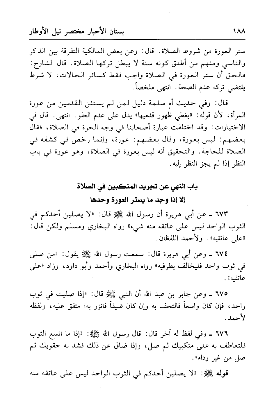 673- عَنْ أَبِي هُرَيْرَةَ أَنَّ رَسُولَ اللَّهِ - صلى الله عليه وسلم - قَالَ: «لَا يُصَلِّيَنَّ أَحَدُكُمْ فِي الثَّوْبِ الْوَاحِدِ لَيْسَ عَلَى عَاتِقِهِ مِنْهُ شَيْءٌ» . رَوَاهُ الْبُخَارِيُّ وَمُسْلِمٌ، وَلَكِنْ قَالَ: «عَلَى عَاتِقَيْهِ» . وَلِأَحْمَدَ اللَّفْظَانِ.