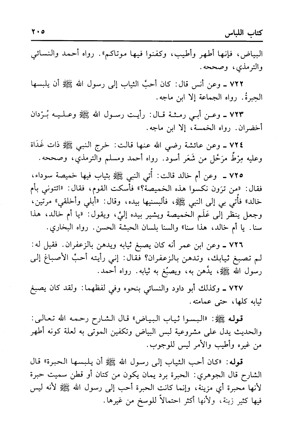 722- وَعَنْ أَنَسٍ قَالَ: كَانَ أَحَبُّ الثِّيَابِ إلَى رَسُولِ اللَّهِ - صلى الله عليه وسلم - أَنْ يَلْبَسَهَا الْحِبَرَةَ. رَوَاهُ الْجَمَاعَةُ إلَّا ابْنَ مَاجَهْ.