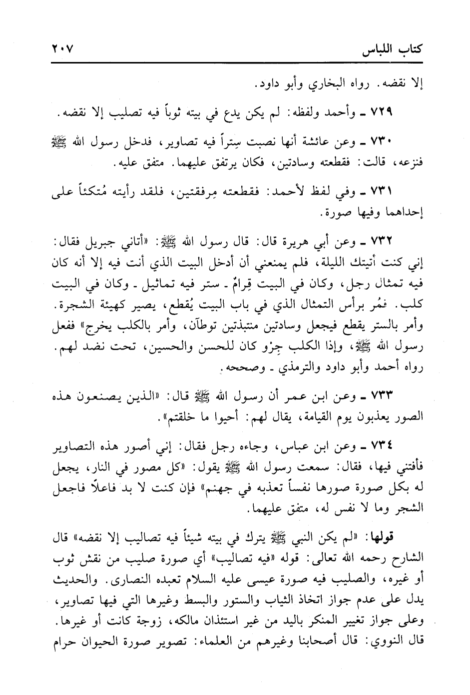 733- وَعَنْ ابْنِ عُمَرَ أَنَّ رَسُولَ اللَّهِ - صلى الله عليه وسلم - قَالَ: «الَّذِينَ يَصْنَعُونَ هَذِهِ الصُّوَرَ يُعَذَّبُونَ يَوْمَ الْقِيَامَةِ يُقَالُ لَهُمْ: أَحْيُوا مَا خَلَقْتُمْ» .
