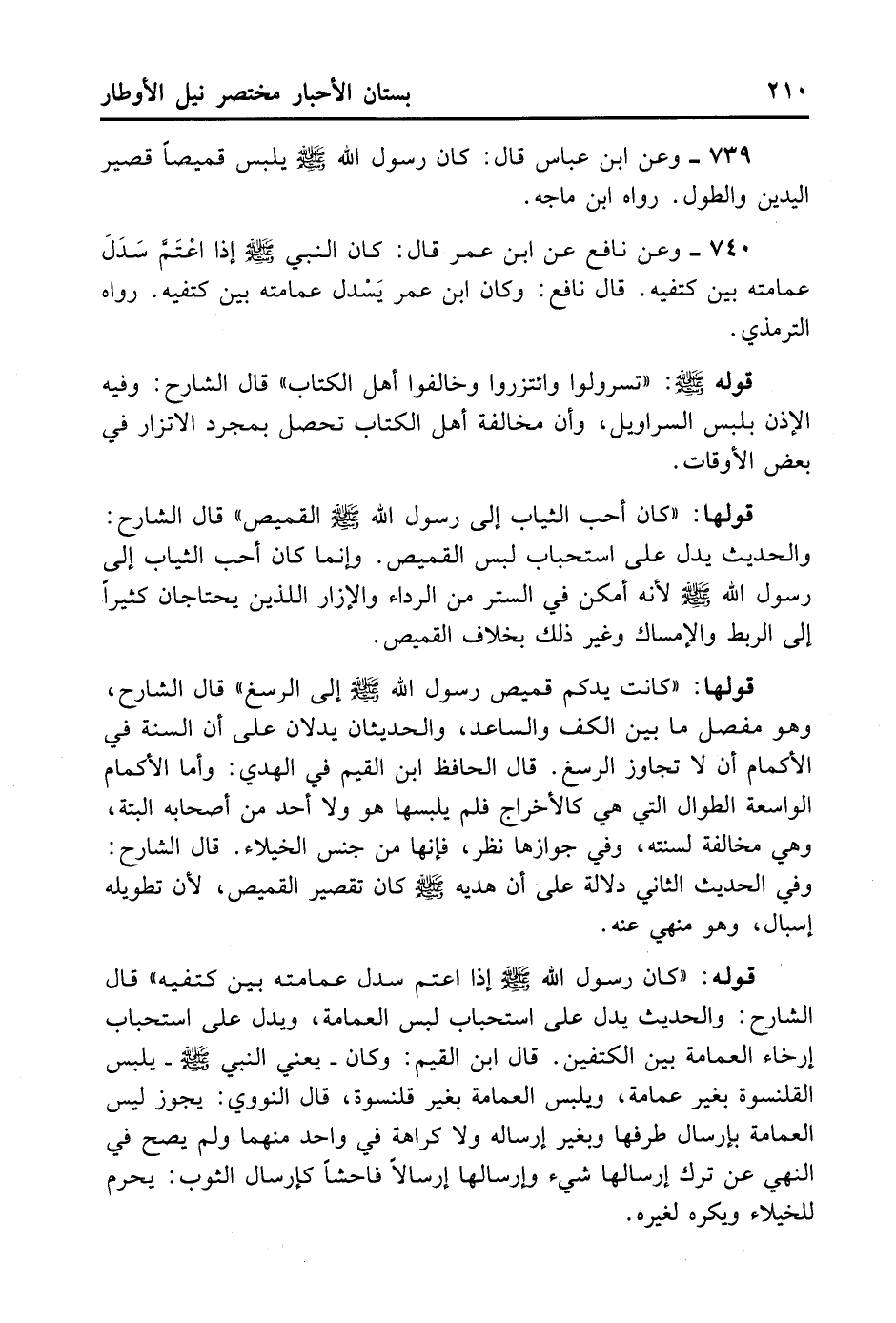 739- وَعَنْ ابْنِ عَبَّاسٍ قَالَ: كَانَ رَسُولُ اللَّهِ - صلى الله عليه وسلم - يَلْبَسُ قَمِيصًا قَصِيرَ الْيَدَيْنِ وَالطُّولِ. رَوَاهُ ابْنُ مَاجَهْ.