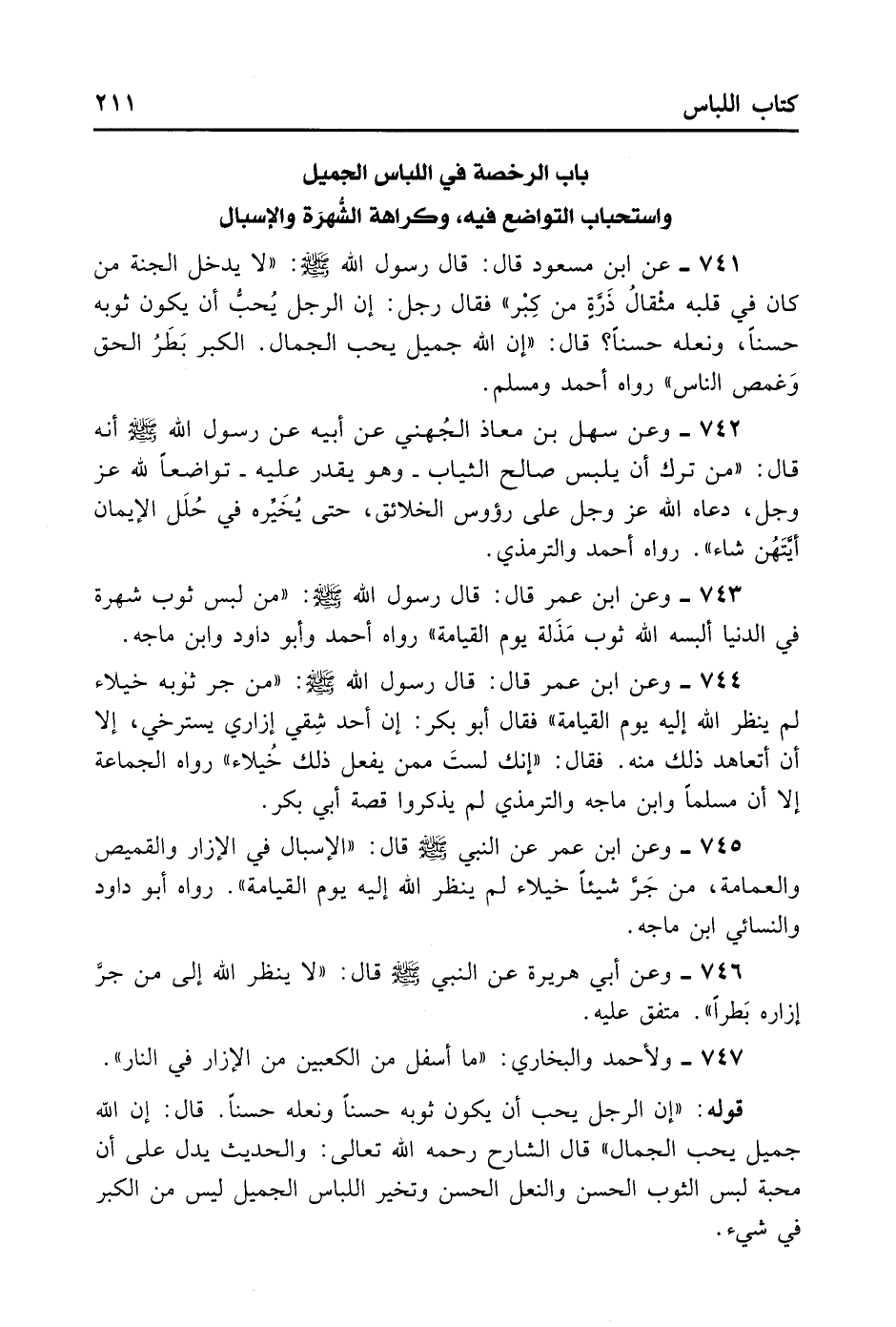 744- وَعَنْ ابْنِ عُمَرَ قَالَ: قَالَ رَسُولُ اللَّهِ - صلى الله عليه وسلم -: «مَنْ جَرَّ ثَوْبَهُ خُيَلَاءَ لَمْ يَنْظُرْ اللَّهُ إلَيْهِ يَوْمَ الْقِيَامَةِ» . فَقَالَ أَبُو بَكْرٍ: إنَّ أَحَدَ شِقَّيْ إزَارِي يَسْتَرْخِي إلَّا أَنْ أَتَعَاهَدَ ذَلِكَ مِنْهُ، فَقَالَ: «إنَّك لَسْت مِمَّنْ يَفْعَلُ ذَلِكَ خُيَلَاءَ» . رَوَاهُ الْجَمَاعَةُ إلَّا أَنَّ مُسْلِمًا وَابْنَ مَاجَهْ وَالتِّرْمِذِيَّ لَمْ يَذْكُرُوا قِصَّةَ أَبِي بَكْرٍ.