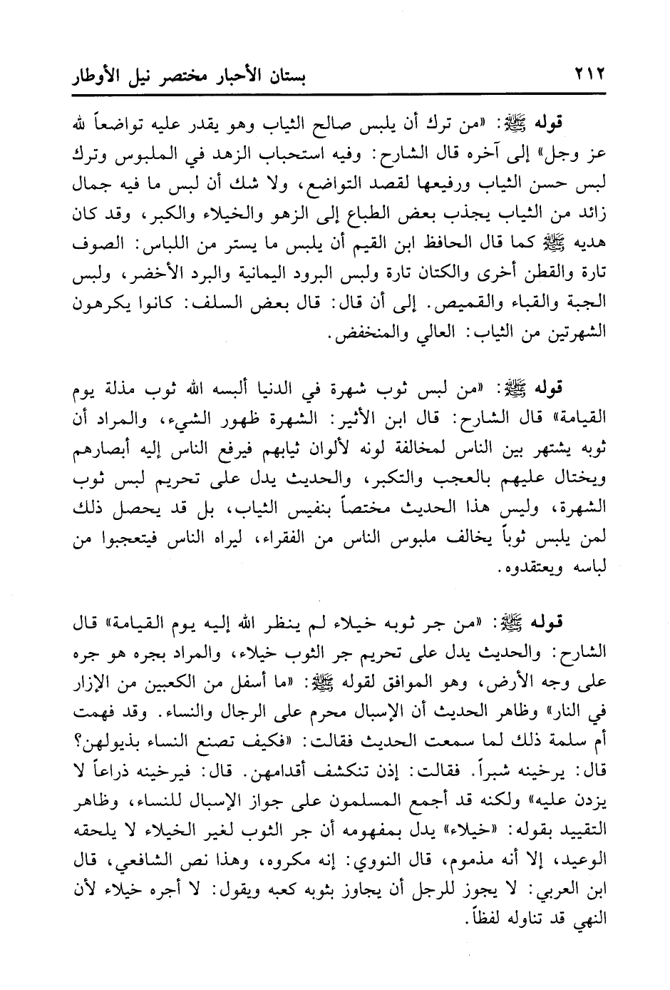 قَوْلُهُ - صلى الله عليه وسلم -: «مَنْ جَرَّ ثَوْبَهُ خُيَلَاءَ لَمْ يَنْظُرْ اللَّهُ إلَيْهِ يَوْمَ الْقِيَامَةِ» . قَالَ الشَّارِحُ: الْحَدِيثُ يَدُلُّ عَلَى تَحْرِيمِ جَرِّ الثَّوْبِ خُيَلَاءَ. وَالْمُرَادُ بِجَرِّهِ هُوَ جَرُّهُ عَلَى وَجْهِ الْأَرْضِ وَهُوَ الْمُوَافِقُ لِقَوْلِهِ - صلى الله عليه وسلم -: «مَا أَسْفَلَ مِنْ الْكَعْبَيْنِ مِنْ الْإِزَارَ فِي النَّارِ» . وَظَاهِرُ الْحَدِيثِ أَنَّ الْإِسْبَالَ مُحَرَّمٌ عَلَى الرِّجَالِ وَالنِّسَاءِ. وَقَدْ فَهِمَتْ