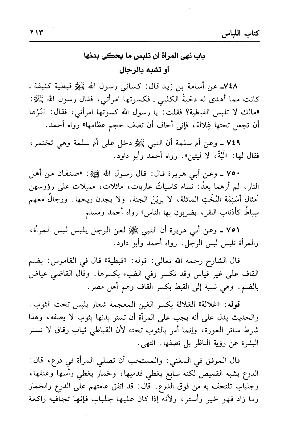 748- عَنْ أُسَامَةَ بْنِ زَيْدٍ قَالَ: كَسَانِي رَسُولُ اللَّهِ - صلى الله عليه وسلم - قُبْطِيَّةً كَثِيفَةً - كَانَتْ مِمَّا أَهْدَى لَهُ دِحْيَةُ الْكَلْبِيُّ - فَكَسَوْتُهَا امْرَأَتِي، فَقَالَ رَسُولُ اللَّهِ - صلى الله عليه وسلم -: «مَا لَكَ لَا تَلْبَسُ الْقُبْطِيَّةَ» ؟ فَقُلْت: يَا رَسُولَ اللَّهِ كَسَوْتُهَا امْرَأَتِي، فَقَالَ: «مُرْهَا أَنْ تَجْعَلَ تَحْتَهَا غِلَالَةً فَإِنِّي أَخَافُ أَنْ تَصِفَ حَجْمَ عِظَامِهَا» . رَوَاهُ أَحْمَدُ.