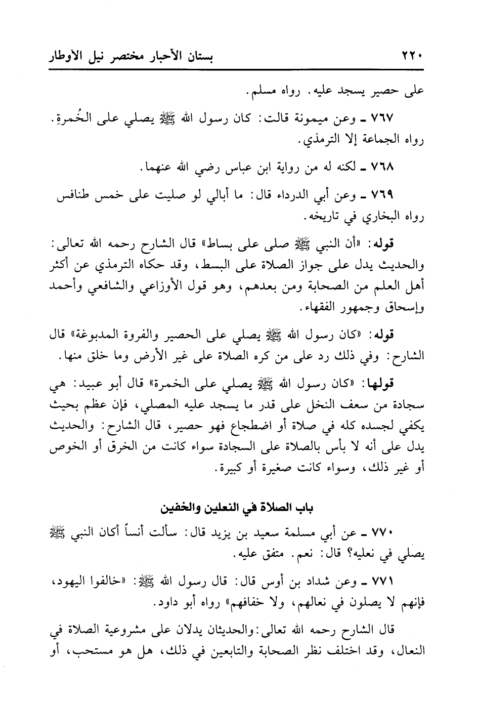 770- عَنْ أَبِي مَسْلَمَةُ سَعِيدِ بْنِ يَزِيدَ قَالَ: سَأَلْت أَنَسًا: أَكَانَ النَّبِيُّ - صلى الله عليه وسلم - يُصَلِّي فِي نَعْلَيْهِ؟ قَالَ: نَعَمْ. مُتَّفَقٌ عَلَيْهِ.