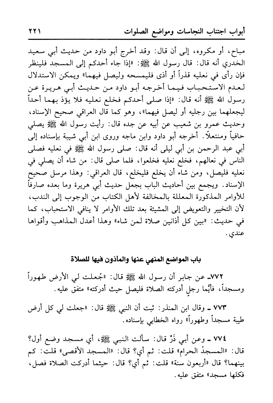 قَالَ: «إذَا صَلَّى أَحَدُكُمْ فَخَلَعَ نَعْلَيْهِ فَلَا يُؤْذِ بِهِمَا أَحَدًا لِيَجْعَلْهُمَا بَيْنَ رِجْلَيْهِ أَوْ لِيُصَلِّ فِيهِمَا» . وَهُوَ كَمَا قَالَ الْعِرَاقِيُّ: صَحِيحُ الْإِسْنَادِ، وَحَدِيثُ عَمْرِو بْنِ شُعَيْبٍ عَنْ أَبِيهِ عَنْ جَدِّهِ قَالَ: رَأَيْت رَسُولَ اللَّهِ - صلى الله عليه وسلم - يُصَلِّي حَافِيًا وَمُنْتَعِلًا. أَخْرَجَهُ أَبُو دَاوُد وَابْنُ مَاجَهْ. وَرَوَى ابْنُ أَبِي شَيْبَةَ بِإِسْنَادِهِ إلَى أَبِي عَبْدِ الرَّحْمَنِ بْنِ أَبِي لَيْلَى أَنَّهُ قَالَ: صَلَّى رَسُولُ اللَّهِ - صلى الله عليه وسلم - فِي نَعْلَيْهِ فَصَلَّى النَّاسُ فِي نِعَالِهِمْ فَخَلَعَ نَعْلَيْهِ فَخَلَعُوا فَلَمَّا صَلَّى قَالَ: «مَنْ شَاءَ أَنْ يُصَلِّيَ فِي نَعْلَيْهِ فَلْيُصَلِّ وَمَنْ شَاءَ أَنْ يَخْلَعَ فَلْيَخْلَعْ» . قَالَ الْعِرَاقِيُّ: وَهَذَا مُرْسَلٌ صَحِيحُ الْإِسْنَادِ وَيُجْمَعُ بَيْنَ أَحَادِيثِ الْبَابِ بِجَعْلِ حَدِيثِ أَبِي هُرَيْرَةَ وَمَا بَعْدَهُ صَارِفًا لِلْأَوَامِرِ الْمَذْكُورَةِ الْمُعَلِّلَةِ بِالْمُخَالَفَةِ لِأَهْلِ الْكِتَابِ مِنْ الْوُجُوبِ إلَى النَّدْبِ لِأَنَّ التَّخْيِيرَ وَالتَّعْوِيضَ إلَى الْمَشِيئَةِ بَعْدَ تِلْكَ الْأَوَامِرِ لَا يُنَافِي الِاسْتِحْبَابَ كَمَا فِي حَدِيثِ «بَيْنَ كُلِّ أَذَانَيْنِ صَلَاةٌ لِمَنْ شَاءَ» . وَهَذَا أَعْدَلُ الْمَذَاهِبِ وَأَقْوَاهَا عِنْدِي.