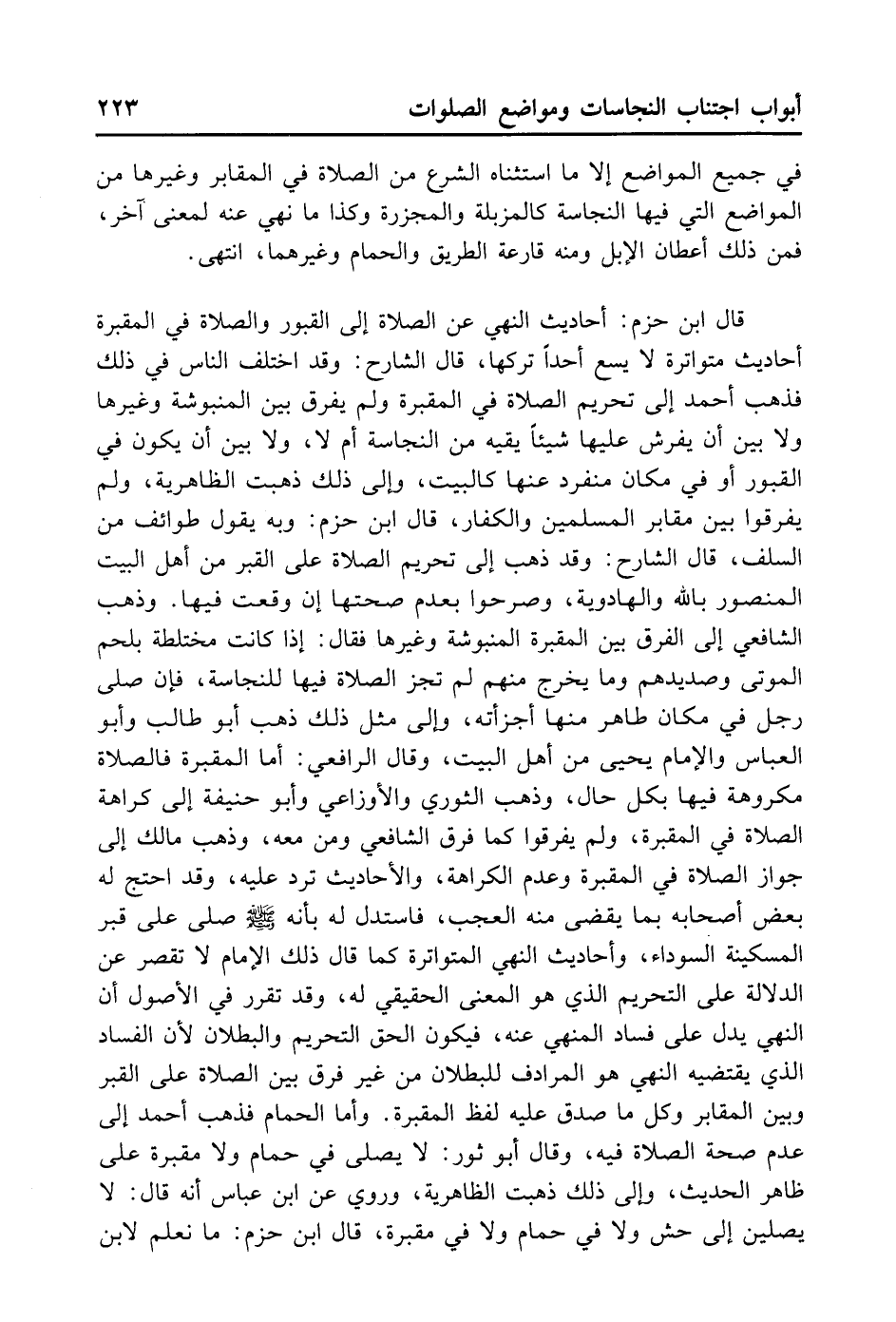 قَالَ ابْنُ حَزْمٍ: أَحَادِيثُ النَّهْيِ عَنْ الصَّلَاةِ إلَى الْقُبُورِ وَالصَّلَاةِ فِي الْمَقْبَرَةِ أَحَادِيثُ مُتَوَاتِرَةٌ لَا يَسَعُ أَحَدًا تَرْكُهَا. قَالَ الشَّارِحُ: وَقَدْ اخْتَلَفَ النَّاسُ فِي ذَلِكَ. فَذَهَبَ أَحْمَدُ إلَى تَحْرِيمِ الصَّلَاةِ فِي الْمَقْبَرَةِ، وَلَمْ يُفَرِّقْ بَيْنَ الْمَنْبُوشَةِ وَغَيْرِهَا، وَلَا بَيْنَ أَنْ يُفْرَشَ عَلَيْهَا شَيْئًا يَقِيهِ مِنْ النَّجَاسَةِ أَمْ لَا، وَلَا بَيْنَ أَنْ يَكُونَ فِي الْقُبُورِ أَوْ فِي مَكَان مُنْفَرِدٍ عَنْهَا كَالْبَيْتِ. وَإِلَى ذَلِكَ ذَهَبَتْ الظَّاهِرِيَّةُ، وَلَمْ يُفَرِّقُوا بَيْنَ مَقَابِرِ الْمُسْلِمِينَ وَالْكُفَّارِ. قَالَ ابْنُ حَزْمٍ: وَبِهِ يَقُولُ طَوَائِفُ مِنْ السَّلَفِ. قَالَ الشَّارِحُ: وَقَدْ ذَهَبَ إلَى تَحْرِيمِ الصَّلَاةِ عَلَى الْقَبْرِ مِنْ أَهْلِ الْبَيْتِ الْمَنْصُورُ بِاَللَّهِ وَالْهَادَوِيَّةُ، وَصَرَّحُوا بِعَدَمِ صِحَّتِهَا إنْ وَقَعَتْ فِيهَا. وَذَهَبَ الشَّافِعِيُّ إلَى الْفَرْقِ بَيْنَ الْمَقْبَرَةِ الْمَنْبُوشَةِ وَغَيْرِهَا، فَقَالَ: إذَا كَانَتْ مُخْتَلِطَةً بِلَحْمِ الْمَوْتَى وَصَدِيدِهِمْ، وَمَا يَخْرُجُ مِنْهُمْ لَمْ تَجُزْ الصَّلَاةُ فِيهَا لِلنَّجَاسَةِ، فَإِنْ صَلَّى رَجُلٌ فِي مَكَان طَاهِرٍ مِنْهَا أَجْزَأَتْهُ. وَإِلَى مِثْلِ ذَلِكَ ذَهَبَ أَبُو طَالِبٍ وَأَبُو الْعَبَّاسِ وَالْإِمَامُ يَحْيَى مِنْ أَهْلِ الْبَيْتِ، وَقَالَ الرَّافِعِيُّ: أَمَّا الْمَقْبَرَةُ فَالصَّلَاةُ مَكْرُوهَةٌ فِيهَا بِكُلِّ حَالٍ. وَذَهَبَ الثَّوْرِيُّ وَالْأَوْزَاعِيُّ وَأَبُو حَنِيفَةَ إلَى كَرَاهَةِ الصَّلَاةِ فِي الْمَقْبَرَةِ وَلَمْ يُفَرِّقُوا كَمَا فَرَّقَ الشَّافِعِيُّ وَمَنْ مَعَهُ. وَذَهَبَ