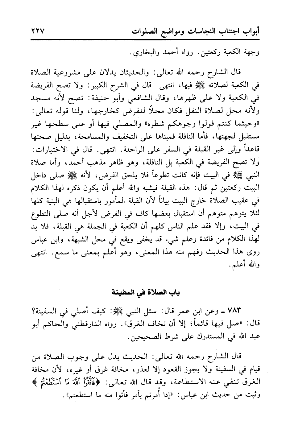 783- عَنْ ابْنِ عُمَرَ قَالَ: سُئِلَ النَّبِيُّ - صلى الله عليه وسلم - كَيْفَ أُصَلِّي فِي السَّفِينَةِ؟ قَالَ: «صَلِّ فِيهَا قَائِمًا، إلَّا أَنْ تَخَافَ الْغَرَقَ» . رَوَاهُ الدَّارَقُطْنِيّ وَالْحَاكِمُ أَبُو عَبْدِ اللَّهِ فِي الْمُسْتَدْرَكِ عَلَى شَرْطِ الصَّحِيحَيْنِ.