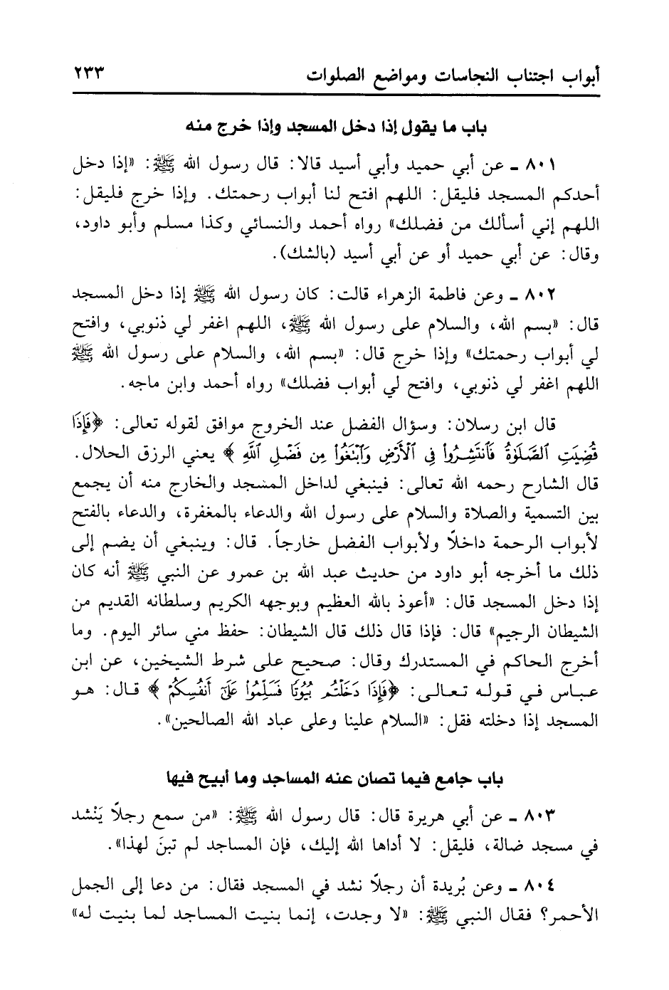 802- وَعَنْ فَاطِمَةَ الزَّهْرَاءِ قَالَتْ: كَانَ رَسُولُ اللَّهِ - صلى الله عليه وسلم - إذَا دَخَلَ الْمَسْجِدَ قَالَ: «بِسْمِ اللَّهِ وَالسَّلَامُ عَلَى رَسُولِ اللَّهِ اللَّهُمَّ اغْفِرْ لِي ذُنُوبِي وَافْتَحْ لِي أَبْوَابَ رَحْمَتِك» . وَاذَا خَرَجَ قَالَ: «بِسْمِ اللَّهِ وَالسَّلَامُ عَلَى رَسُولِ اللَّهِ - صلى الله عليه وسلم - اللَّهُمَّ اغْفِرْ لِي ذُنُوبِي وَافْتَحْ لِي أَبْوَابَ فَضْلِك» . رَوَاهُ أَحْمَدُ وَابْنُ مَاجَهْ.