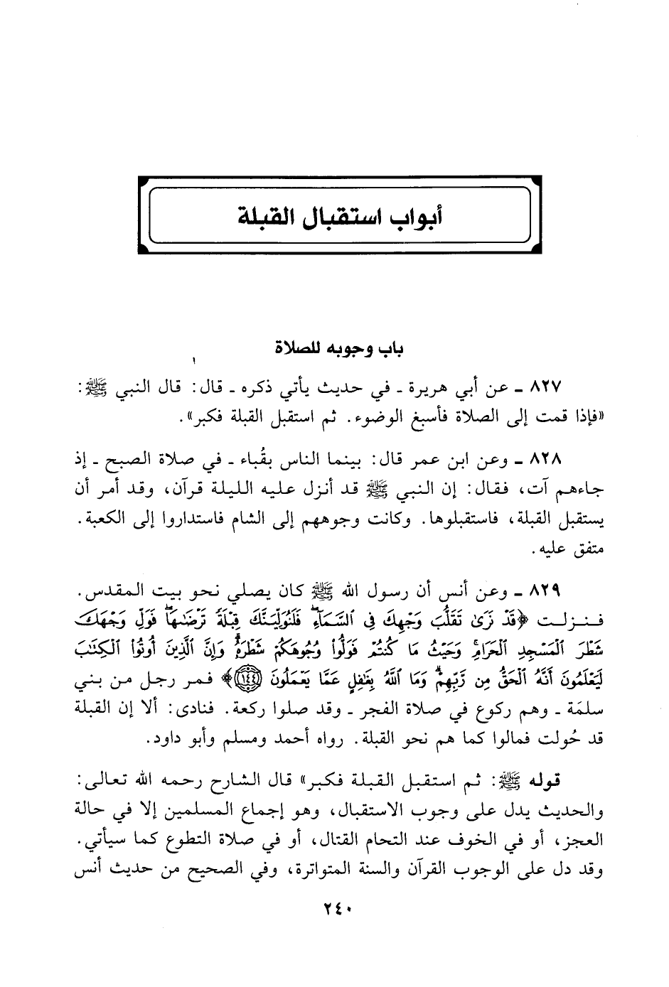 829- وَعَنْ أَنَسٍ أَنَّ رَسُولَ اللَّهِ - صلى الله عليه وسلم - كَانَ يُصَلِّي نَحْوَ بَيْتِ الْمَقْدِسِ فَنَزَلَتْ: {قَدْ نَرَى تَقَلُّبَ وَجْهِكَ فِي السَّمَاء فَلَنُوَلِّيَنَّكَ قِبْلَةً تَرْضَاهَا فَوَلِّ وَجْهَكَ شَطْرَ الْمَسْجِدِ الْحَرَامِ وَحَيْثُ مَا كُنتُمْ فَوَلُّواْ وُجُوِهَكُمْ شَطْرَهُ وَإِنَّ الَّذِينَ أُوْتُواْ الْكِتَابَ لَيَعْلَمُونَ أَنَّهُ الْحَقُّ مِن رَّبِّهِمْ وَمَا اللهُ بِغَافِلٍ عَمَّا يَعْمَلُونَ} . فَمَرَّ رَجُلٌ مِنْ بَنِي سَلِمَةَ - وَهُمْ رُكُوعٌ فِي صَلَاةِ الْفَجْرِ - وَقَدْ صَلَّوْا رَكْعَةً فَنَادَى: أَلَا إنَّ الْقِبْلَةَ قَدْ حُوِّلَتْ، فَمَالُوا كَمَا هُمْ نَحْوَ الْقِبْلَةِ. رَوَاهُ أَحْمَدُ وَمُسْلِمٌ وَأَبُو دَاوُد.
