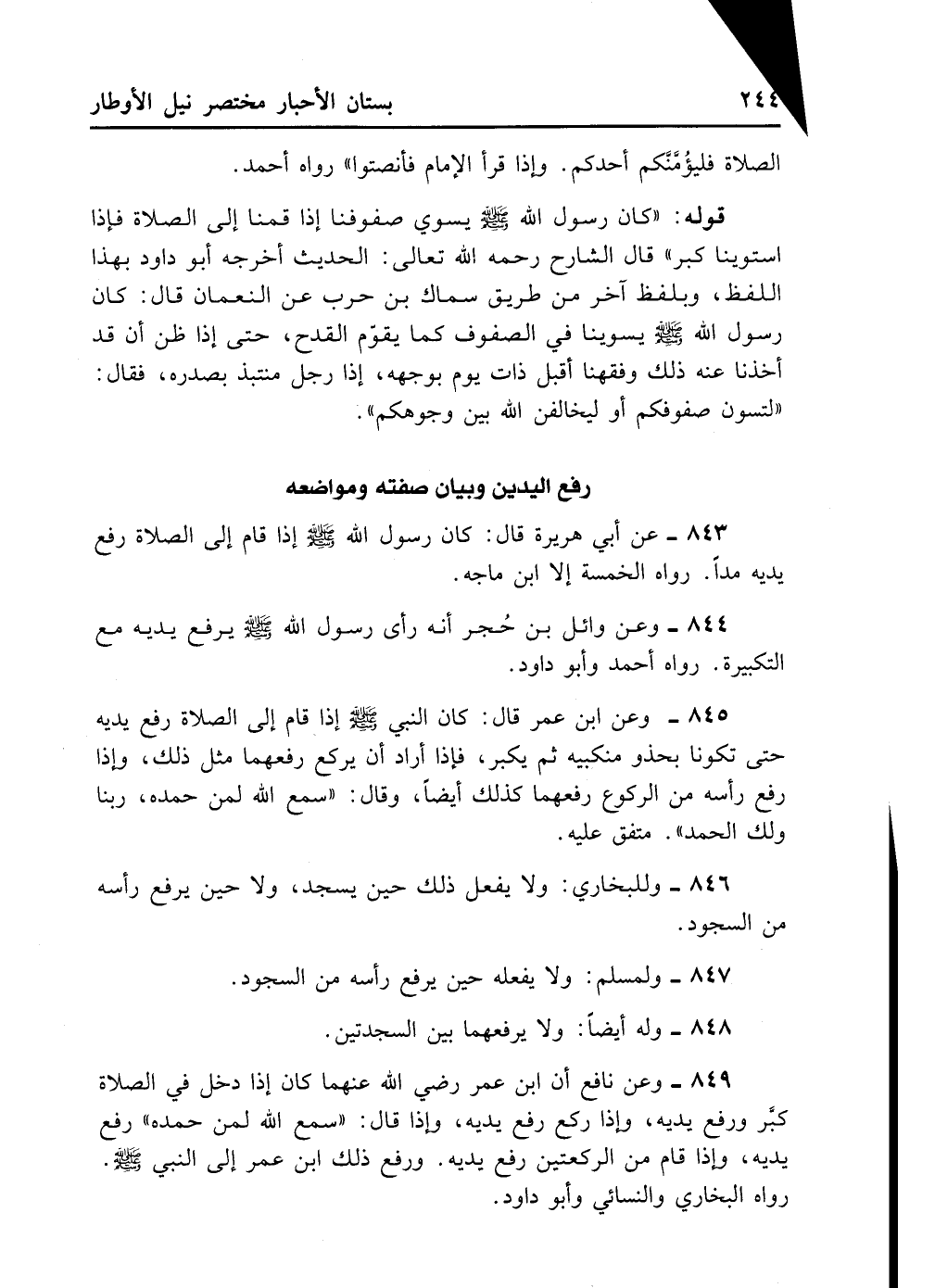 844- وَعَنْ وَائِلِ بْنِ حُجْرٍ أَنَّهُ رَأَى رَسُولَ اللَّهِ - صلى الله عليه وسلم - يَرْفَعُ يَدَيْهِ مَعَ التَّكْبِيرَةِ. رَوَاهُ أَحْمَدُ وَأَبُو دَاوُد.