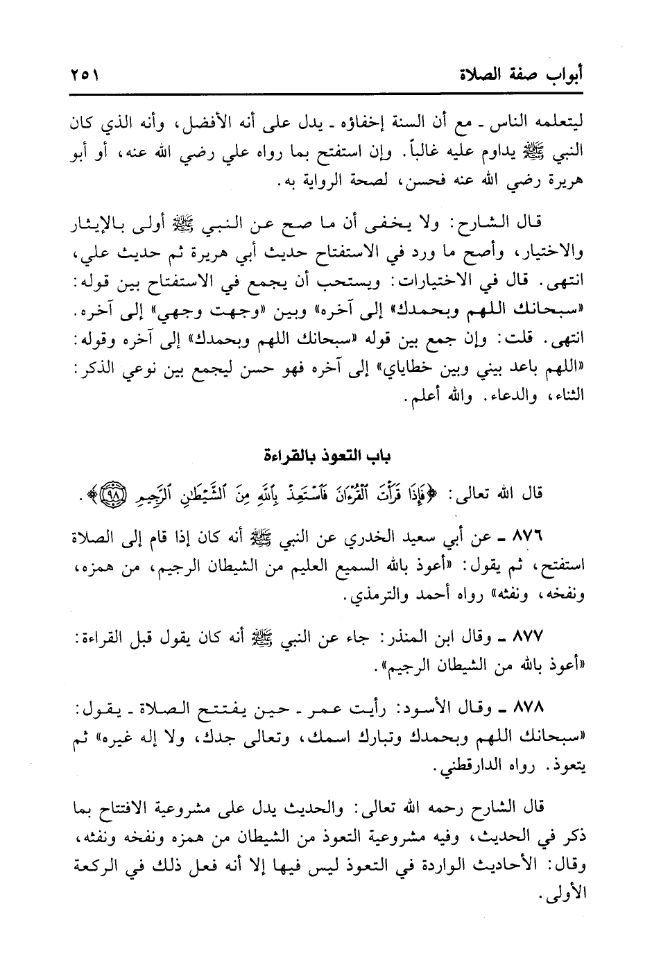876- وَعَنْ أَبِي سَعِيدٍ الْخُدْرِيِّ عَنْ النَّبِيِّ - صلى الله عليه وسلم - أَنَّهُ كَانَ إذَا قَامَ إلَى الصَّلَاةِ اسْتَفْتَحَ ثُمَّ يَقُولُ: «أَعُوذُ بِاَللَّهِ السَّمِيعِ الْعَلِيمِ مِنْ الشَّيْطَانِ الرَّجِيمِ مِنْ هَمْزِهِ وَنَفْخِهِ وَنَفْثِهِ» . رَوَاهُ أَحْمَدُ وَالتِّرْمِذِيُّ.