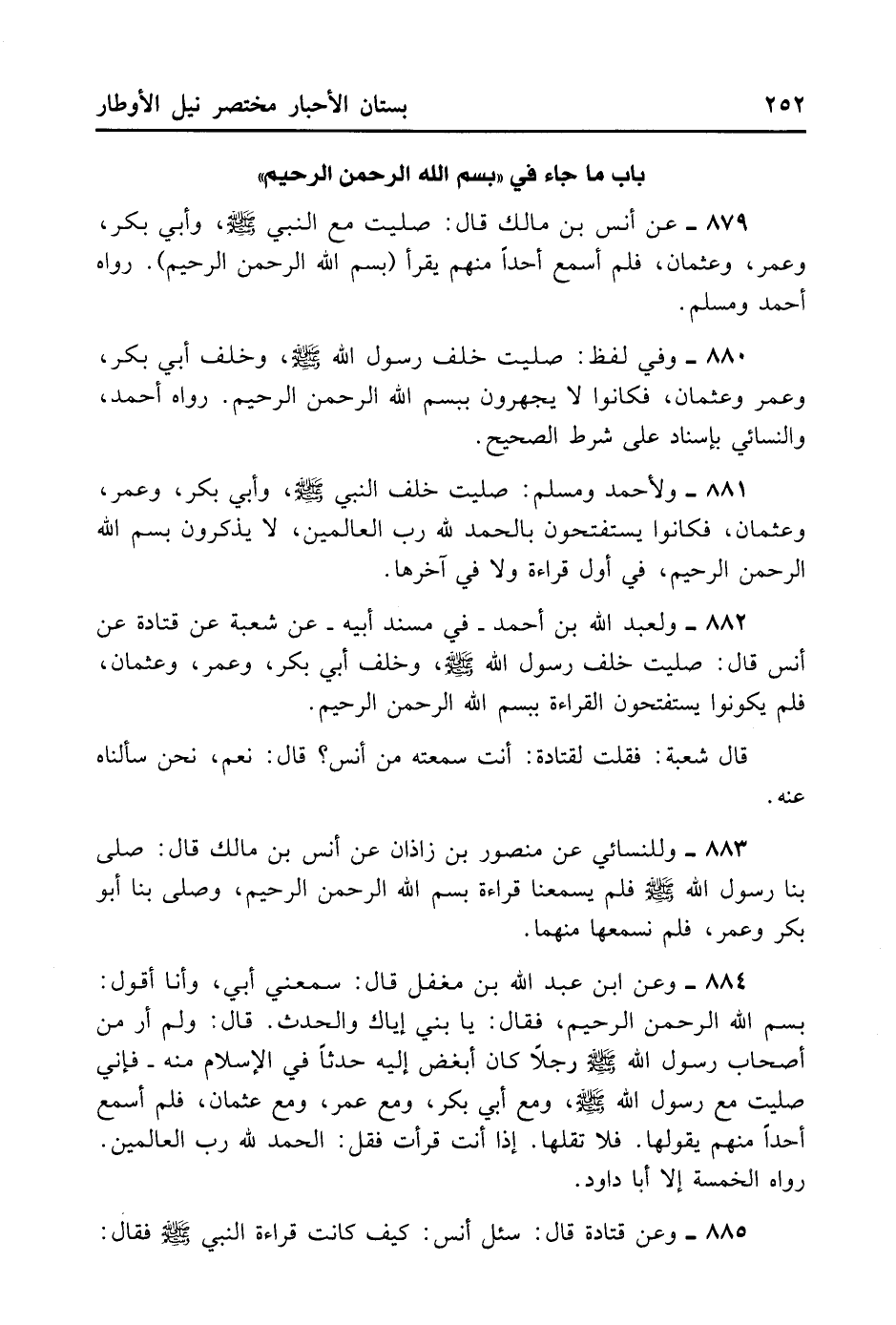 881- وَلِأَحْمَدَ وَمُسْلِمٌ: صَلَّيْت خَلْفَ النَّبِيِّ - صلى الله عليه وسلم - وَأَبِي بَكْرٍ وَعُمَرَ وَعُثْمَانَ وَكَانُوا يَسْتَفْتِحُونَ بِالْحَمْدُ لِلَّهِ رَبِّ الْعَالَمِينَ لَا يَذْكُرُونَ بِسْمِ اللَّهِ الرَّحْمَنِ الرَّحِيمِ فِي أَوَّلِ قِرَاءَةٍ وَلَا فِي آخِرِهَا.