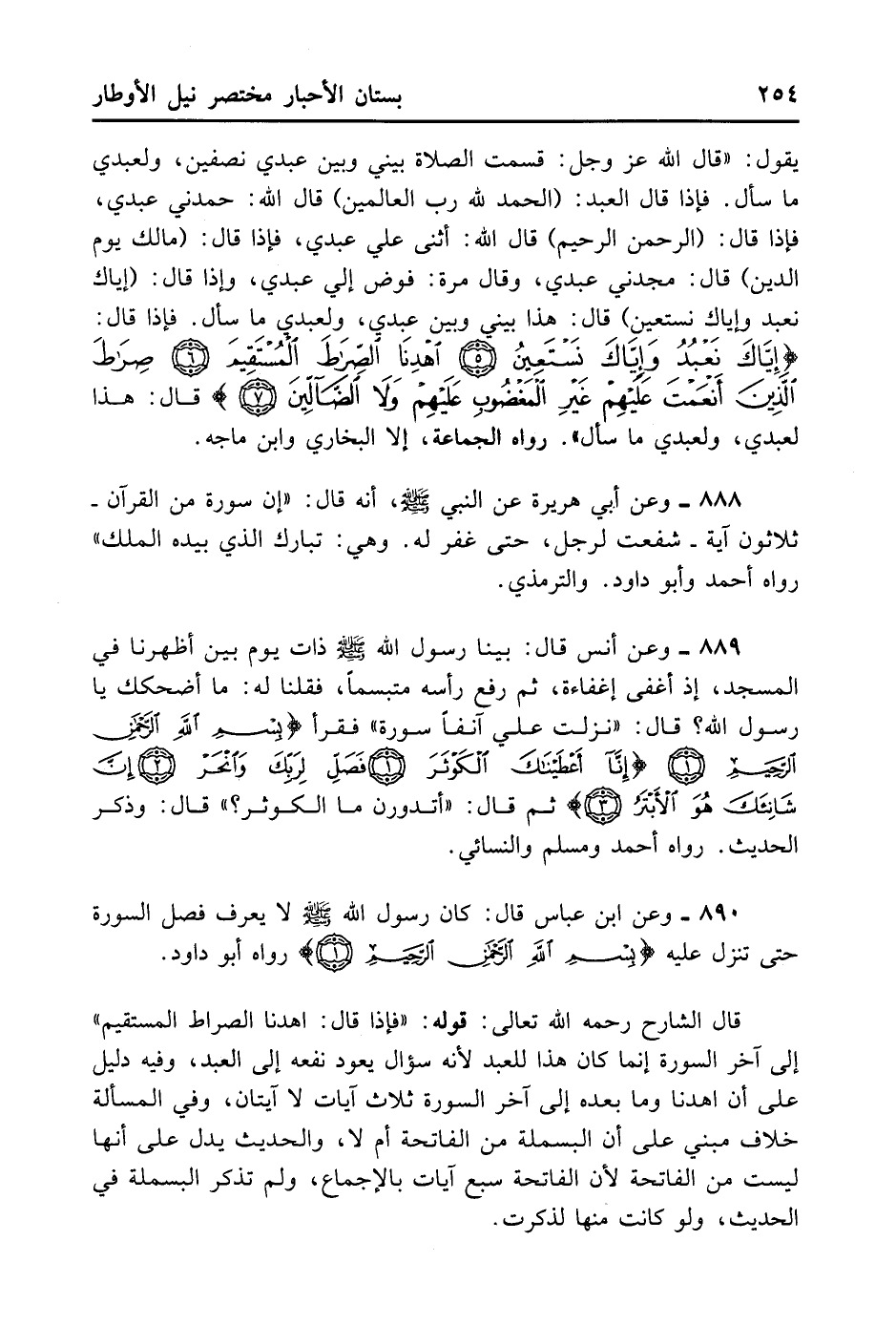 889- وَعَنْ أَنَسٍ قَالَ: بَيْنَا رَسُولُ اللَّهِ - صلى الله عليه وسلم - ذَاتَ يَوْمٍ بَيْنَ أَظْهُرِنَا فِي الْمَسْجِدِ إذْ أَغْفَى، ثُمَّ رَفَعَ رَأْسَهُ مُتَبَسِّمًا، فَقُلْنَا لَهُ: مَا أَضْحَكَك يَا رَسُولَ اللَّهِ؟ فَقَالَ: «نَزَلَتْ عَلَيَّ آنِفًا سُورَةٌ فَقَرَأَ: {بِسْمِ اللَّهِ الرَّحْمَنِ الرَّحِيمِ إنَّا أَعْطَيْنَاك الْكَوْثَرَ * فَصَلِّ لِرَبِّك وَانْحَرْ * إنَّ شَانِئَك هُوَ الْأَبْتَرُ} » . ثُمَّ قَالَ: «أَتَدْرُونَ مَا الْكَوْثَرَ» ؟ قَالَ: وَذَكَرَ الْحَدِيثَ. رَوَاهُ أَحْمَدُ وَمُسْلِمٌ وَالنَّسَائِيُّ.