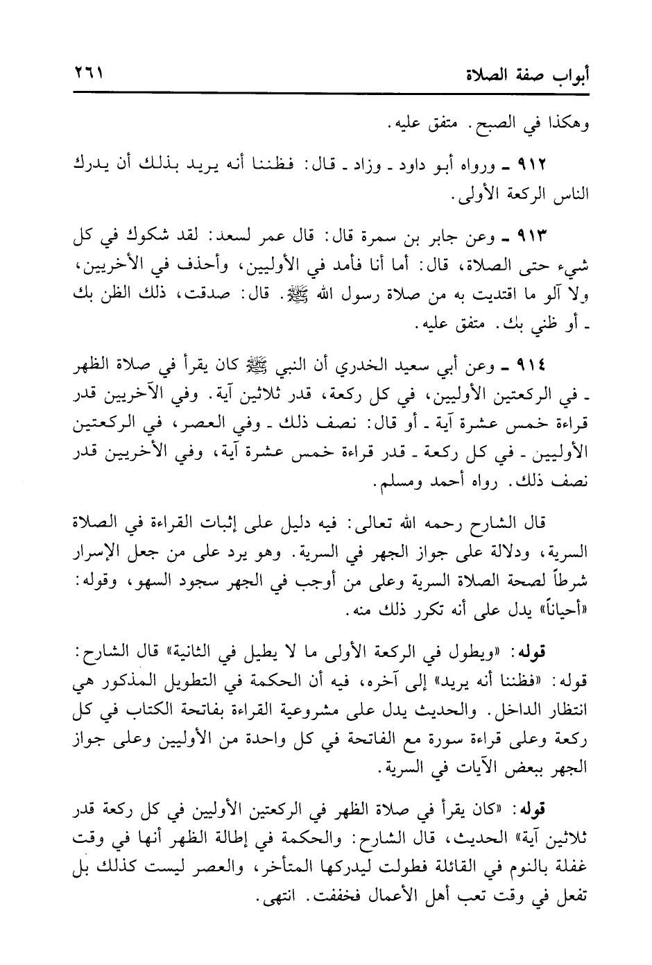 914- وَعَنْ أَبِي سَعِيدٍ الْخُدْرِيِّ أَنَّ النَّبِيَّ - صلى الله عليه وسلم - كَانَ يَقْرَأُ فِي صَلَاةِ الظُّهْرِ فِي الرَّكْعَتَيْنِ الْأُولَيَيْنِ فِي كُلِّ رَكْعَةٍ قَدْرَ ثَلَاثِينَ آيَةً. وَفِي الْأُخْرَيَيْنِ قَدْرَ قِرَاءَةِ خَمْسَ عَشْرَةَ آيَةً - أَوْ قَالَ نِصْفَ ذَلِكَ - وَفِي الْعَصْرِ فِي الرَّكْعَتَيْنِ الْأُولَيَيْنِ - فِي كُلِّ رَكْعَةٍ - قَدْرَ قِرَاءَةِ خَمْسَ عَشْرَةَ آيَةً، وَفِي الْأُخْرَيَيْنِ قَدْرَ نِصْفِ ذَلِكَ. رَوَاهُ أَحْمَدُ وَمُسْلِمٌ.