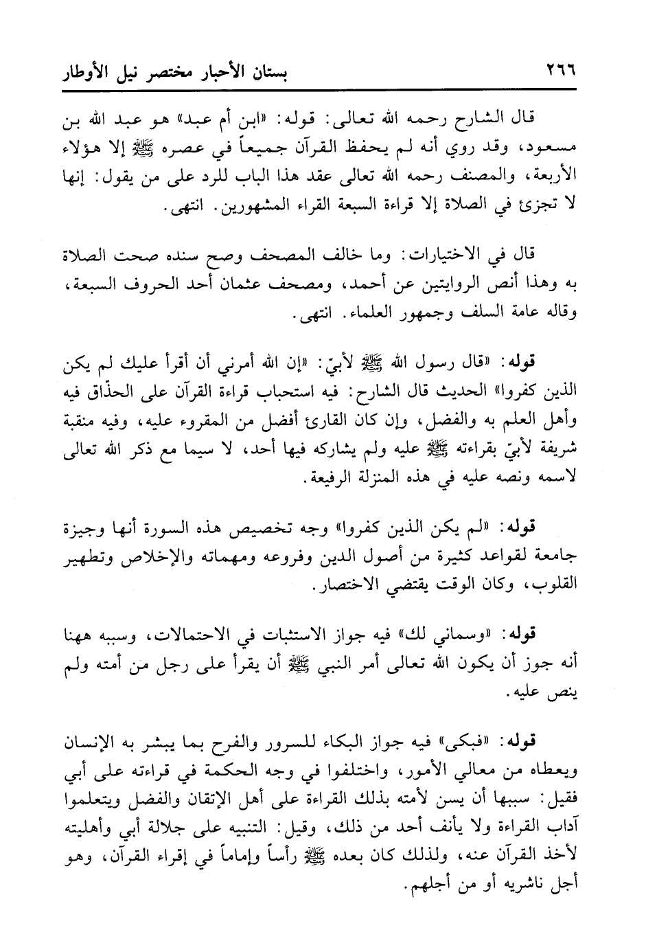 قَالَ الشَّارِحُ رَحِمَهُ اللَّهُ تَعَالَى: قَوْلُهُ: «ابْنِ أُمِّ عَبْدٍ» هُوَ عَبْدُ اللَّهِ بْنُ مَسْعُودٍ وَقَدْ رُوِيَ أَنَّهُ لَمْ يَحْفَظْ الْقُرْآنَ جَمِيعًا فِي عَصْرِهِ - صلى الله عليه وسلم - إلَّا هَؤُلَاءِ الْأَرْبَعَةُ. وَالْمُصَنِّفُ رَحِمَهُ اللَّهُ عَقَدَ هَذَا الْبَابَ لِلرَّدِّ عَلَى مَنْ يَقُولُ: إنَّهَا لَا تُجْزِئُ فِي الصَّلَاةِ إلَّا قِرَاءَةُ السَّبْعَةِ الْقُرَّاءِ الْمَشْهُورِينَ. انْتَهَى.