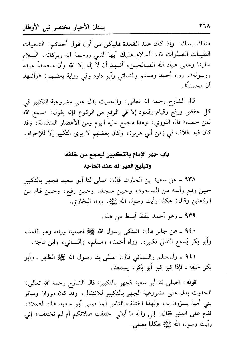 938- عَنْ سَعِيدِ بْنِ الْحَارِثِ قَالَ: صَلَّى بِنَا أَبُو سَعِيدٍ فَجَهَرَ بِالتَّكْبِيرِ حِينَ رَفَعَ رَأْسَهُ مِنْ السُّجُودِ، وَحِينَ سَجَدَ، وَحِينَ رَفَعَ، وَحِينَ قَامَ مِنْ الرَّكْعَتَيْنِ وَقَالَ: هَكَذَا رَأَيْتُ رَسُولَ اللَّهِ - صلى الله عليه وسلم -. رَوَاهُ الْبُخَارِيُّ.