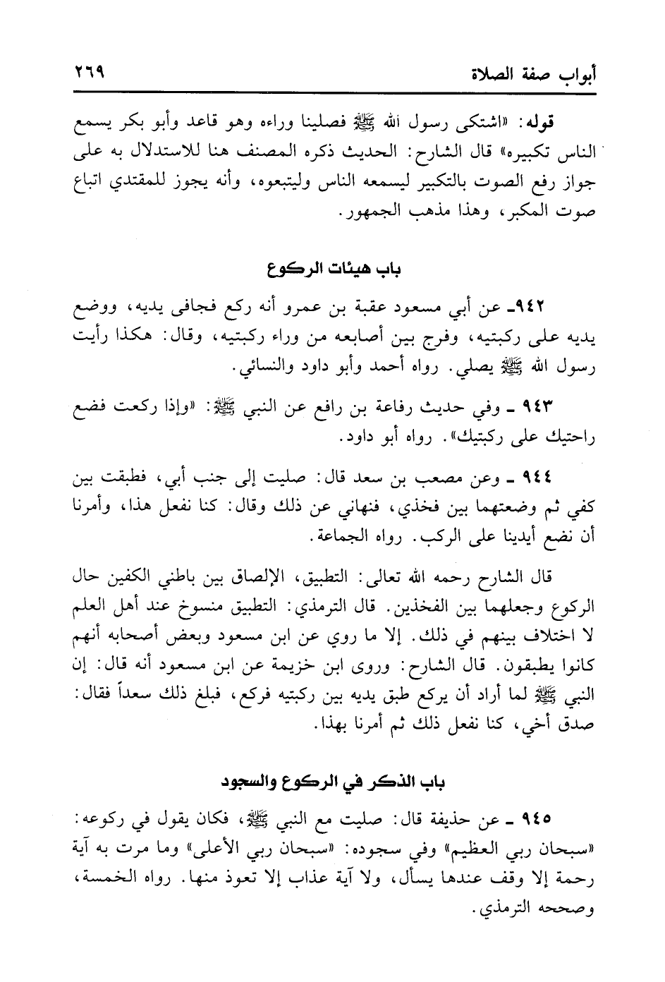 942- عَنْ أَبِي مَسْعُودٍ عُقْبَةَ بْنِ عَمْرٍو أَنَّهُ رَكَعَ فَجَافَى يَدَيْهِ وَوَضَعَ ... يَدَيْهِ عَلَى رُكْبَتَيْهِ وَفَرَّجَ بَيْنَ أَصَابِعِهِ مِنْ وَرَاءِ رُكْبَتَيْهِ، وَقَالَ: هَكَذَا رَأَيْتُ رَسُولَ اللَّهِ - صلى الله عليه وسلم - يُصَلِّي. رَوَاهُ أَحْمَدُ وَأَبُو دَاوُد وَالنَّسَائِيُّ.