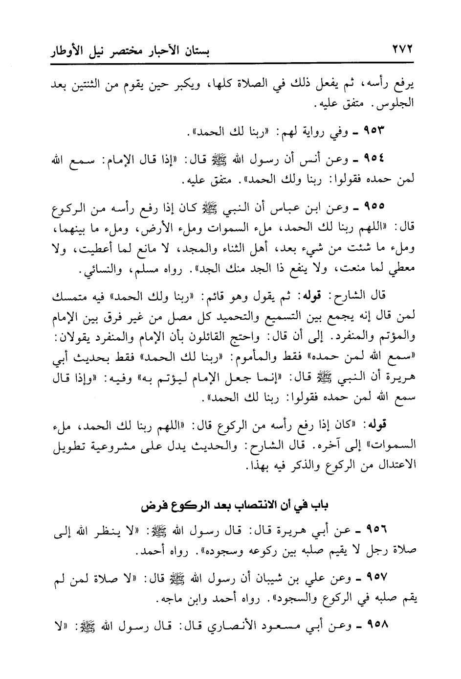 قَوْلُهُ: كَانَ إذَا رَفَعَ رَأْسَهُ مِنْ الرُّكُوعِ قَالَ: «اللَّهُمَّ رَبَّنَا لَكَ الْحَمْدُ مِلْءَ السَّمَوَاتِ» . إلى آخره قَالَ الشَّارِحُ: وَالْحَدِيثُ يَدُلُّ عَلَى مَشْرُوعِيَّةِ تَطْوِيلِ الِاعْتِدَالِ مِنْ الرُّكُوعِ وَالذِّكْرِ فِيهِ بِهَذَا.