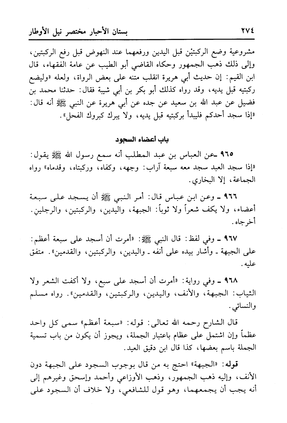 965- عَنْ الْعَبَّاسِ بْنِ عَبْدِ الْمُطَّلِبِ أَنَّهُ سَمِعَ رَسُولَ اللَّهِ - صلى الله عليه وسلم - يَقُولُ: «إذَا سَجَدَ الْعَبْدُ سَجَدَ مَعَهُ سَبْعَةُ آرَابٍ: وَجْهُهُ وَكَفَّاهُ وَرُكْبَتَاهُ وَقَدَمَاهُ» . رَوَاهُ الْجَمَاعَةُ إلَّا الْبُخَارِيَّ.