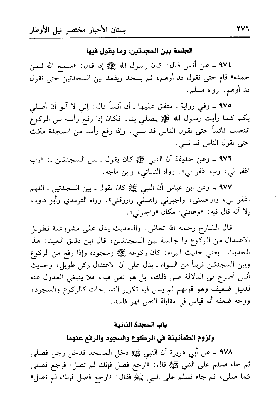 قَالَ الشَّارِحُ رَحِمَهُ اللَّهُ تَعَالَى: وَالْحَدِيثُ يَدُلُّ عَلَى مَشْرُوعِيَّةِ تَطْوِيلِ الِاعْتِدَالِ مِنْ الرُّكُوعِ وَالْجِلْسَةِ بَيْنَ السَّجْدَتَيْنِ. قَالَ ابْنُ دَقِيقِ الْعِيدِ: هَذَا الْحَدِيثُ - يعني حَدِيث الْبَرَاءِ كَانَ رُكُوعُهُ - صلى الله عليه وسلم - وَسُجُودُهُ وَإِذَا رَفَعَ مِنْ الرُّكُوعِ وَبَيْنَ السَّجْدَتَيْنِ قَرِيبًا مِنْ السَّوَاءِ - يَدُلُّ عَلَى أَنَّ الِاعْتِدَالَ رُكْنٌ طَوِيلٌ وَحَدِيثُ أَنَسٍ أَصْرَحُ فِي الدَّلَالَةِ عَلَى ذَلِكَ بَلْ هُوَ نَصٌّ فِيهِ، فَلَا يَنْبَغِي الْعُدُولُ عَنْهُ لِدَلِيلٍ ضَعِيفٍ وَهُوَ قَوْلُهِمْ لَمْ يُسَنَّ فِيهِ تَكْرِيرُ التَّسْبِيحَاتِ كَالرُّكُوعِ وَالسُّجُودِ. وَوَجْهُ ضَعْفِهِ أَنَّهُ قِيَاسٌ فِي مُقَابَلَةِ النَّصِّ فَهُوَ فَاسِدٌ.