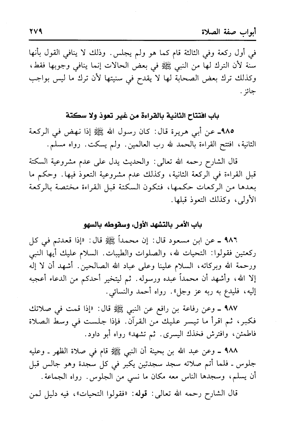 985- عَنْ أَبِي هُرَيْرَةَ قَالَ: كَانَ رَسُولُ اللَّهِ - صلى الله عليه وسلم - إِذَا نَهَضَ فِي الرَّكْعَةِ الثَّانِيَةِ افْتَتَحَ الْقِرَاءَةَ بِـ {الْحَمْدُ لِلَّهِ رَبِّ الْعَالَمِينَ} وَلَمْ يَسْكُتْ. رَوَاهُ مُسْلِمٌ.