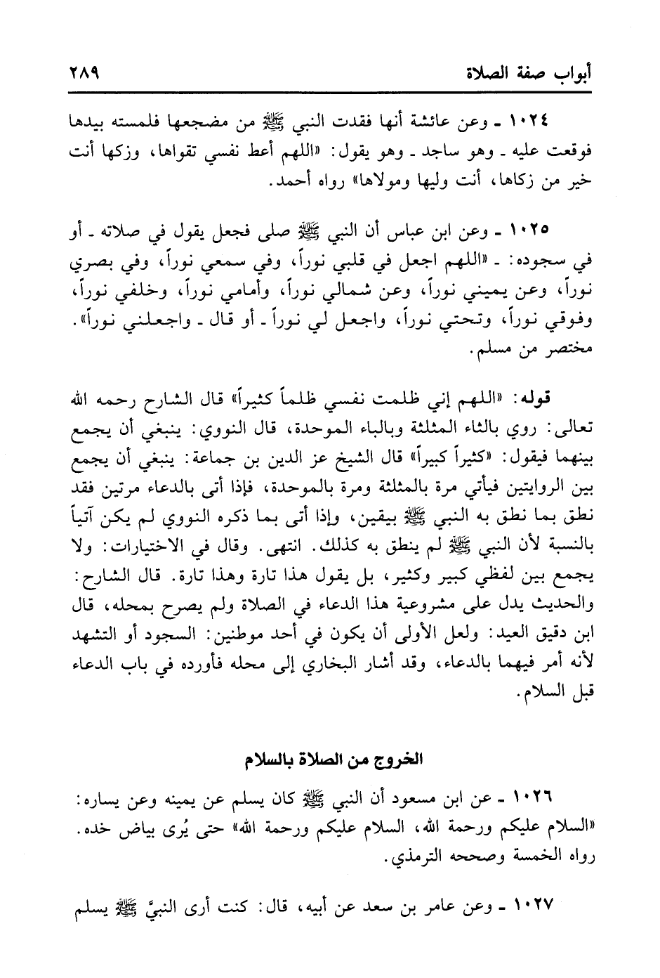 1026- عَنْ ابْنِ مَسْعُودٍ أَنَّ النَّبِيَّ - صلى الله عليه وسلم - كَانَ يُسَلِّمُ عَنْ يَمِينِهِ وَعَنْ يَسَارِهِ: السَّلَامُ عَلَيْكُمْ وَرَحْمَةُ اللَّهِ، السَّلَامُ عَلَيْكُمْ وَرَحْمَةُ اللَّهِ حَتَّى يُرَى بَيَاضُ خَدِّهِ. رَوَاهُ الْخَمْسَةُ وَصَحَّحَهُ التِّرْمِذِيُّ.