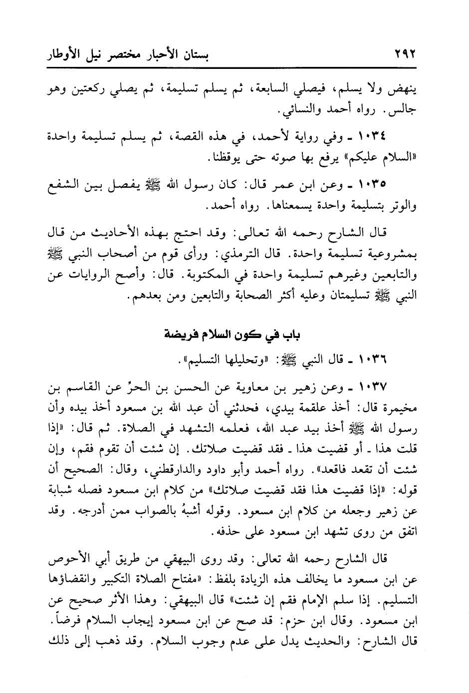 1034- وَفِي رِوَايَةٍ لِأَحْمَدَ فِي هَذِهِ الْقِصَّةِ ثُمَّ يُسَلِّمُ تَسْلِيمَةً وَاحِدَةً السَّلَامُ عَلَيْكُمْ يَرْفَعُ بِهَا صَوْتَهُ حَتَّى يُوقِظَنَا.