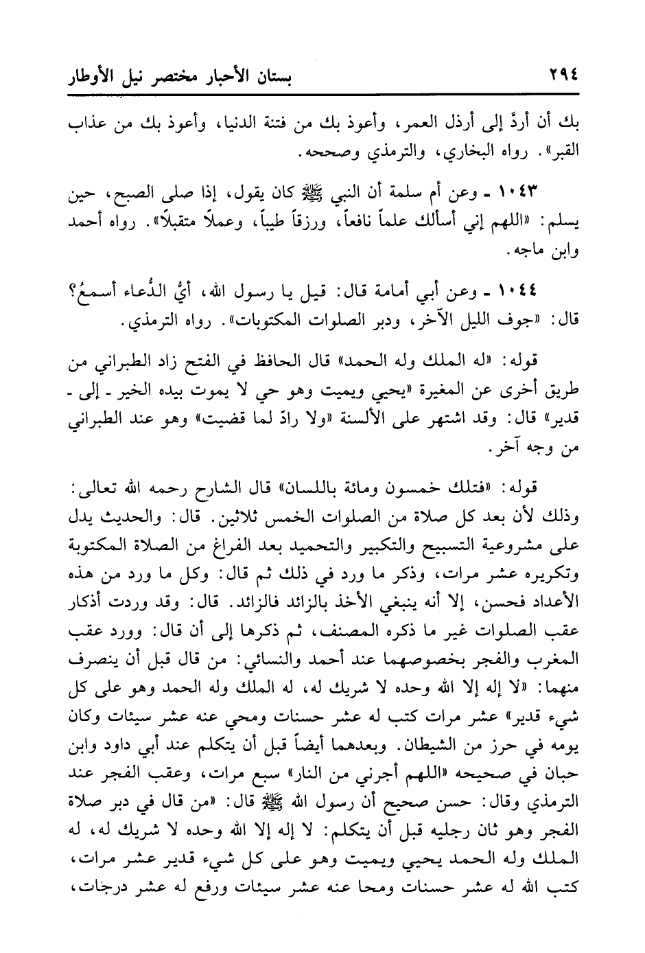 1043- وَعَنْ أُمِّ سَلَمَةَ أَنَّ النَّبِيَّ - صلى الله عليه وسلم - كَانَ يَقُولُ إذَا صَلَّى الصُّبْحَ حِينَ يُسَلِّمُ: «اللَّهُمَّ إنِّي أَسْأَلُكَ عِلْمًا نَافِعًا، وَرِزْقًا طَيِّبًا، وَعَمَلًا مُتَقَبَّلًا» . رَوَاهُ أَحْمَدُ وَابْنُ مَاجَهْ.