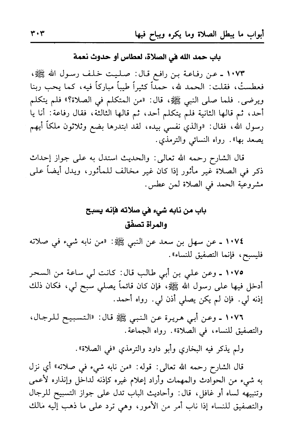 قَالَ الشَّارِحُ رَحِمَهُ اللَّهُ تَعَالَى: وَالْحَدِيثُ اُسْتُدِلَّ بِهِ عَلَى جَوَازِ إحْدَاثِ ذِكْرٍ فِي الصَّلَاةِ غَيْرِ مَأْثُورٍ إذَا كَانَ غَيْرَ مُخَالِفٍ لِلْمَأْثُورِ. وَيَدُلُّ أَيْضًا عَلَى مَشْرُوعِيَّةِ الْحَمْدِ فِي الصَّلَاةِ لِمَنْ عَطَسَ.