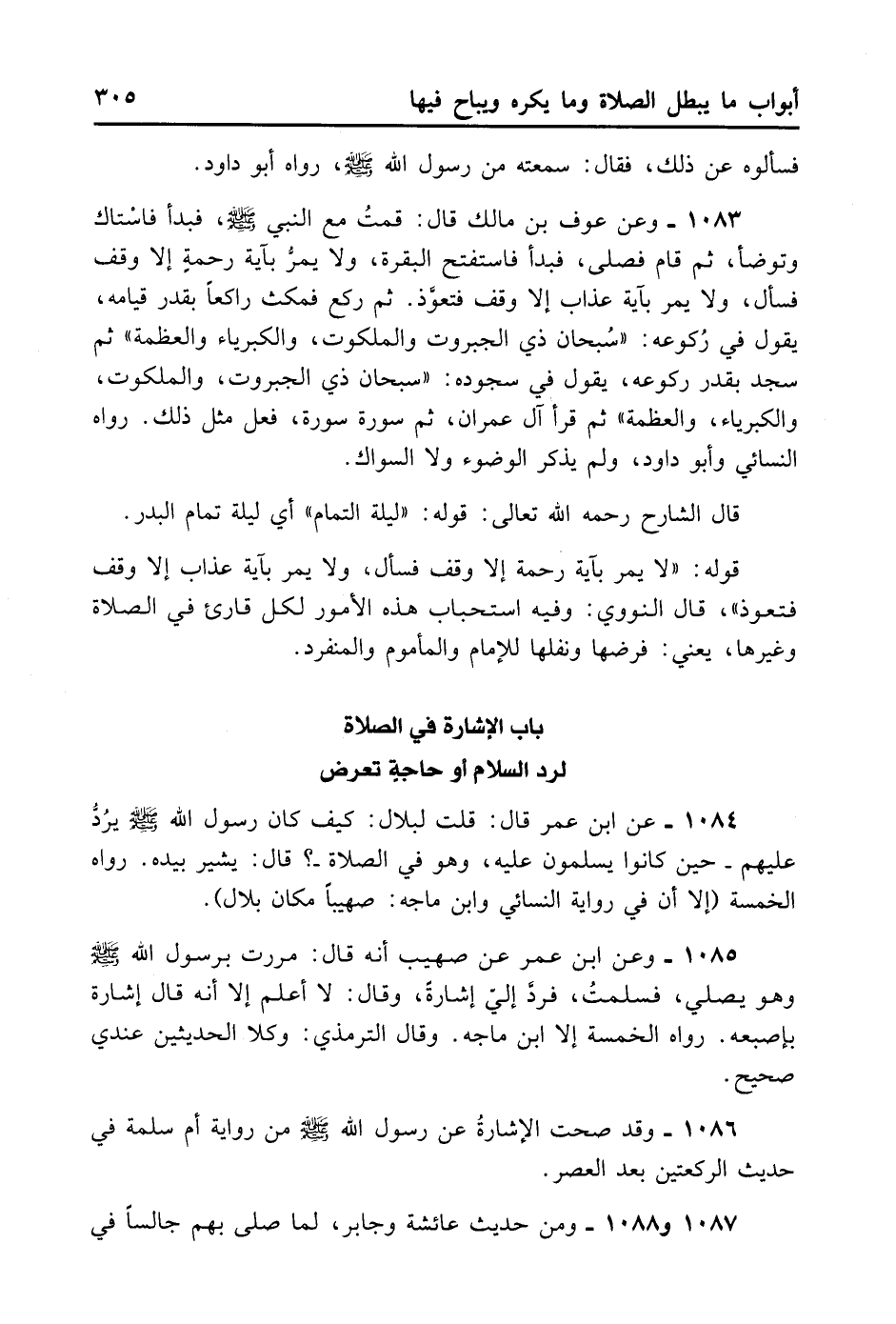 1084- وَعَنْ ابْنِ عُمَرَ قَالَ: قُلْت لِبِلَالٍ: كَيْفَ كَانَ رَسُولُ اللَّهِ - صلى الله عليه وسلم - يَرُدُّ عَلَيْهِمْ حِينَ كَانُوا يُسَلِّمُونَ عَلَيْهِ وَهُوَ فِي الصَّلَاةِ؟ ، قَالَ: يُشِيرُ بِيَدِهِ. رَوَاهُ الْخَمْسَةُ إلَّا أَنَّ فِي رِوَايَةِ النَّسَائِيّ وَابْنِ مَاجَهْ صُهَيْبًا مَكَانُ بِلَالٍ.