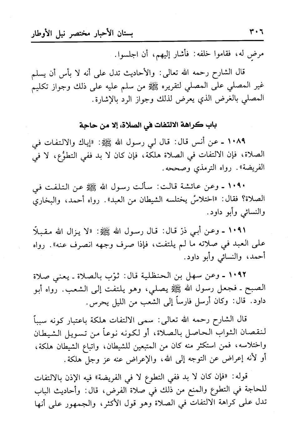 1089- عَنْ أَنَسٍ قَالَ: قَالَ لِي رَسُولُ اللَّهِ - صلى الله عليه وسلم -: «إِيَّاكَ وَالِالْتِفَاتَ فِي الصَّلَاةِ، فَإِنَّ الِالْتِفَاتَ فِي الصَّلَاةِ هَلَكَةٌ، فَإِنْ كَانَ لَا بُدَّ فَفِي التَّطَوُّعِ لَا فِي الْفَرِيضَةِ» . رَوَاهُ التِّرْمِذِيُّ وَصَحَّحَهُ.