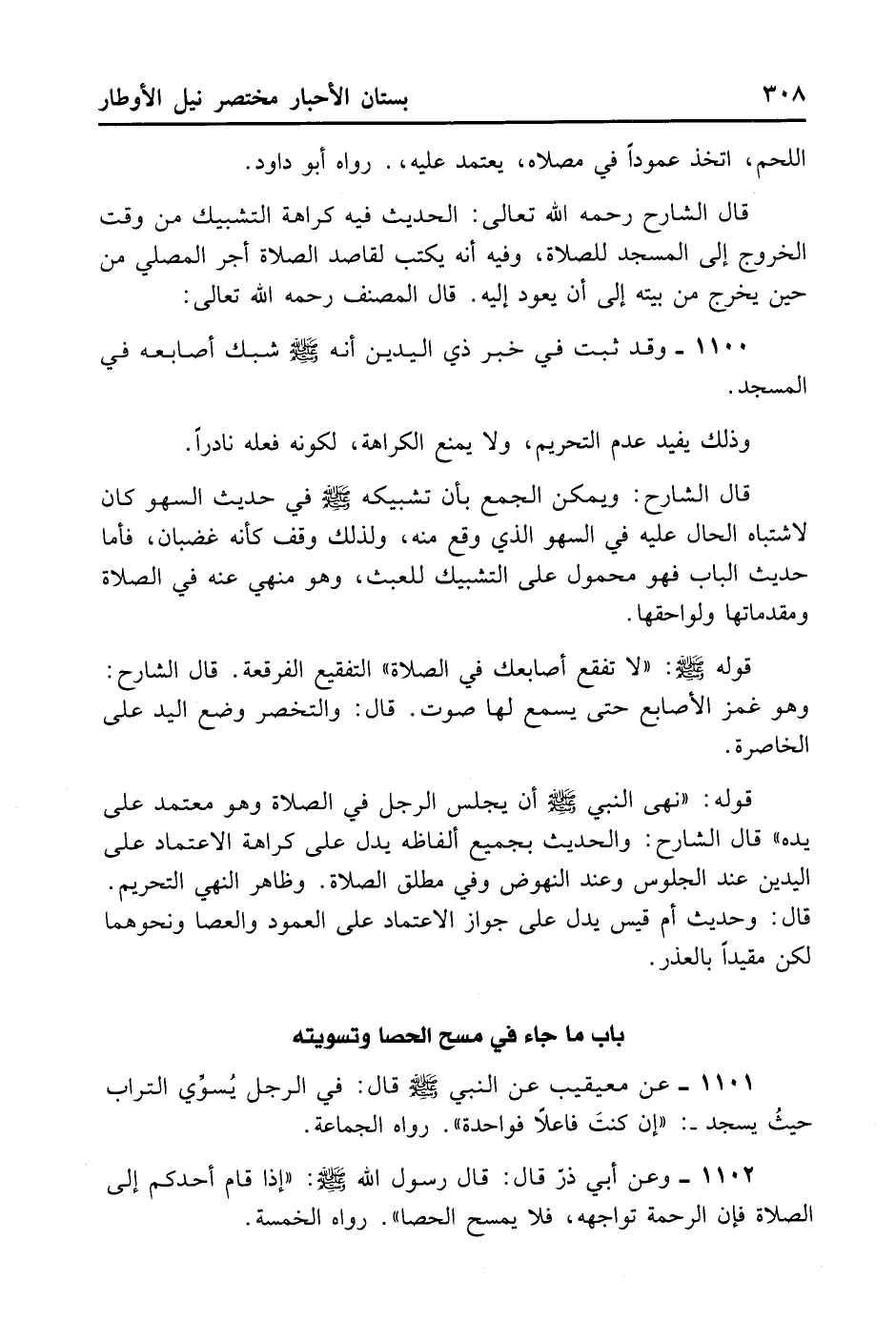 1100- وَقَدْ ثَبَتَ فِي خَبَرِ ذِي الْيَدَيْنِ أَنَّهُ - صلى الله عليه وسلم - شَبَّكَ أَصَابِعَهُ فِي الْمَسْجِدِ.