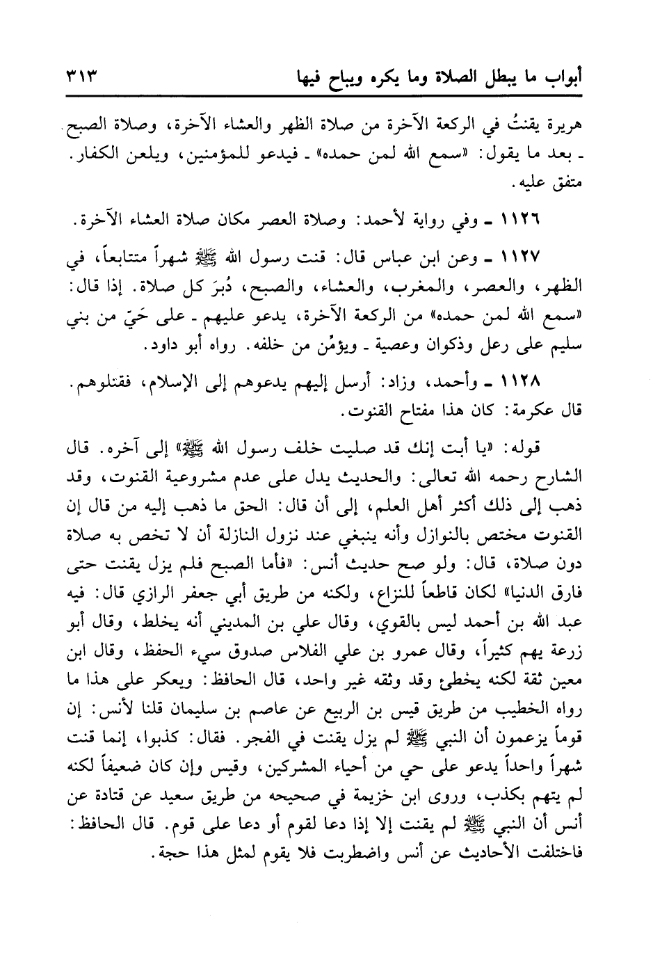قَوْلُهُ: (يَا أَبَتِ إنَّك قَدْ صَلَّيْت خَلْفَ رَسُولِ اللَّهِ - صلى الله عليه وسلم -) إِلَى آخِرِهِ. قَالَ الشَّارِحُ رَحِمَهُ اللَّهُ تَعَالَى: وَالْحَدِيثُ يَدُلُّ عَلَى عَدَمِ مَشْرُوعِيَّةِ الْقُنُوتِ وَقَدْ ذَهَبَ إلَى ذَلِكَ أَكْثَرُ أَهْلِ الْعِلْمِ. إِلِى أَنْ قَالَ: الْحَقُّ مَا ذَهَبَ إلَيْهِ مَنْ قَالَ: إنَّ الْقُنُوتَ مُخْتَصٌّ بِالنَّوَازِلِ وَإِنَّهُ يَنْبَغِي عِنْدَ نُزُولِ النَّازِلَةِ أَنْ لَا تُخَصَّ بِهِ صَلَاةٌ دُونَ صَلَاةٍ. قال: وَلَوْ صَحَّ حَدِيث أَنَسٍ: (فَأَمَّا الصُّبْحُ فَلَمْ يَزَلْ يَقْنُتُ حَتَّى فَارَقَ الدُّنْيَا) . لَكَانَ قَاطِعًا لِلنِّزَاعِ، وَلَكِنَّهُ مِنْ طَرِيقِ أَبِي جَعْفَرٍ الرَّازِيّ قَالَ فِيهِ عَبْدُ اللَّهِ بْنُ أَحْمَدَ: لَيْسَ بِالْقَوِيِّ. وَقَالَ عَلِيُّ بْنُ الْمَدِينِيِّ: إنَّهُ يَخْلِطُ. وَقَالَ أَبُو زُرْعَةَ: يَهِمُ كَثِيرًا. وَقَالَ عَمْرُو بْنُ عَلِيٍّ الْفَلَّاسُ: صَدُوقٌ سَيِّئُ الْحِفْظِ. وَقَالَ ابْنُ مَعِينٍ: ثِقَةٌ وَلَكِنَّهُ يُخْطِئُ. وَقَدْ وَثَّقَهُ غَيْرُ وَاحِدٍ. قَالَ الْحَافِظُ: وَيُعَكِّرُ عَلَى هَذَا مَا رَوَاهُ الْخَطِيبُ مِنْ طَرِيقِ قَيْسِ بْنِ الرَّبِيعِ عَنْ عَاصِمِ بْنِ سُلَيْمَانَ قُلْنَا لِأَنَسٍ إنَّ قَوْمًا مَا يَزْعُمُونَ أَنَّ النَّبِيَّ - صلى الله عليه وسلم - لَمْ يَزَلْ يَقْنُتُ فِي الْفَجْرِ فَقَالَ: كَذَبُوا إنَّمَا قَنَتَ شَهْرًا وَاحِدًا يَدْعُو عَلَى حَيٍّ مِنْ أَحْيَاءِ الْمُشْرِكِينَ، وَقَيْسٌ وَإِنْ كَانَ ضَعِيفًا لَكِنَّهُ لَمْ يُتَّهَمْ بِالْكَذِبِ. وَرَوَى ابْنُ خُزَيْمَةَ فِي صَحِيحِهِ مِنْ طَرِيقِ سَعِيدٍ عَنْ قَتَادَةَ عَنْ أَنَسٍ أَنَّ النَّبِيَّ - صلى الله عليه وسلم - لَمْ يَقْنُتْ إلَّا إذَا دَعَا لِقَوْمٍ أَوْ دَعَا عَلَى قَوْمٍ. قَالَ الْحَافِظُ: فَاخْتَلَفَتْ الْأَحَادِيثُ عَنْ أَنَسٍ وَاضْطَرَبَتْ، فَلَا يَقُومُ لِمِثْلِ هَذَا حُجَّةٌ.