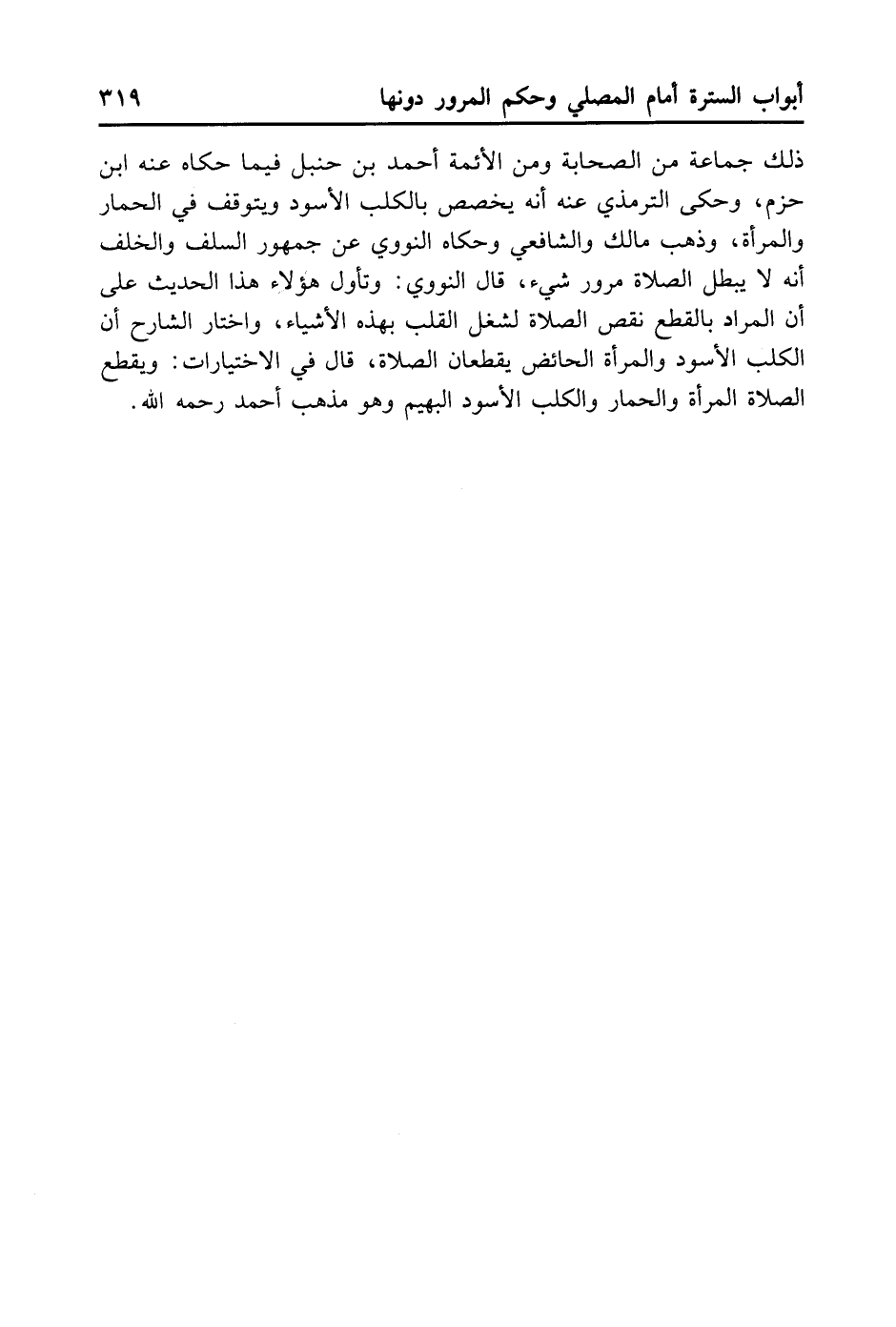 وَذَهَبَ مَالِكٌ وَالشَّافِعِيُّ وَحَكَاهُ النَّوَوِيُّ عَنْ جُمْهُورِ الْعُلَمَاءِ مِنْ السَّلَفِ وَالْخَلَفِ: أَنَّهُ لَا يُبْطِلُ الصَّلَاةَ مُرُورُ شَيْءٍ. قَالَ النَّوَوِيُّ: وَتَأَوَّلَ هَؤُلَاءِ هَذَا الْحَدِيثَ عَلَى أَنَّ الْمُرَادَ بِالْقَطْعِ نَقْصُ الصَّلَاةِ لِشُغْلِ الْقَلْبِ بِهَذِهِ الْأَشْيَاءِ. وَاخْتَارَ الشَّارِحُ: أَنَّ الْكَلْبَ الأَسْوَدَ وَالْمَرْأَةَ الْحَائِضِ يَقْطَعَانِ الصَّلاةِ. قَالَ فِي