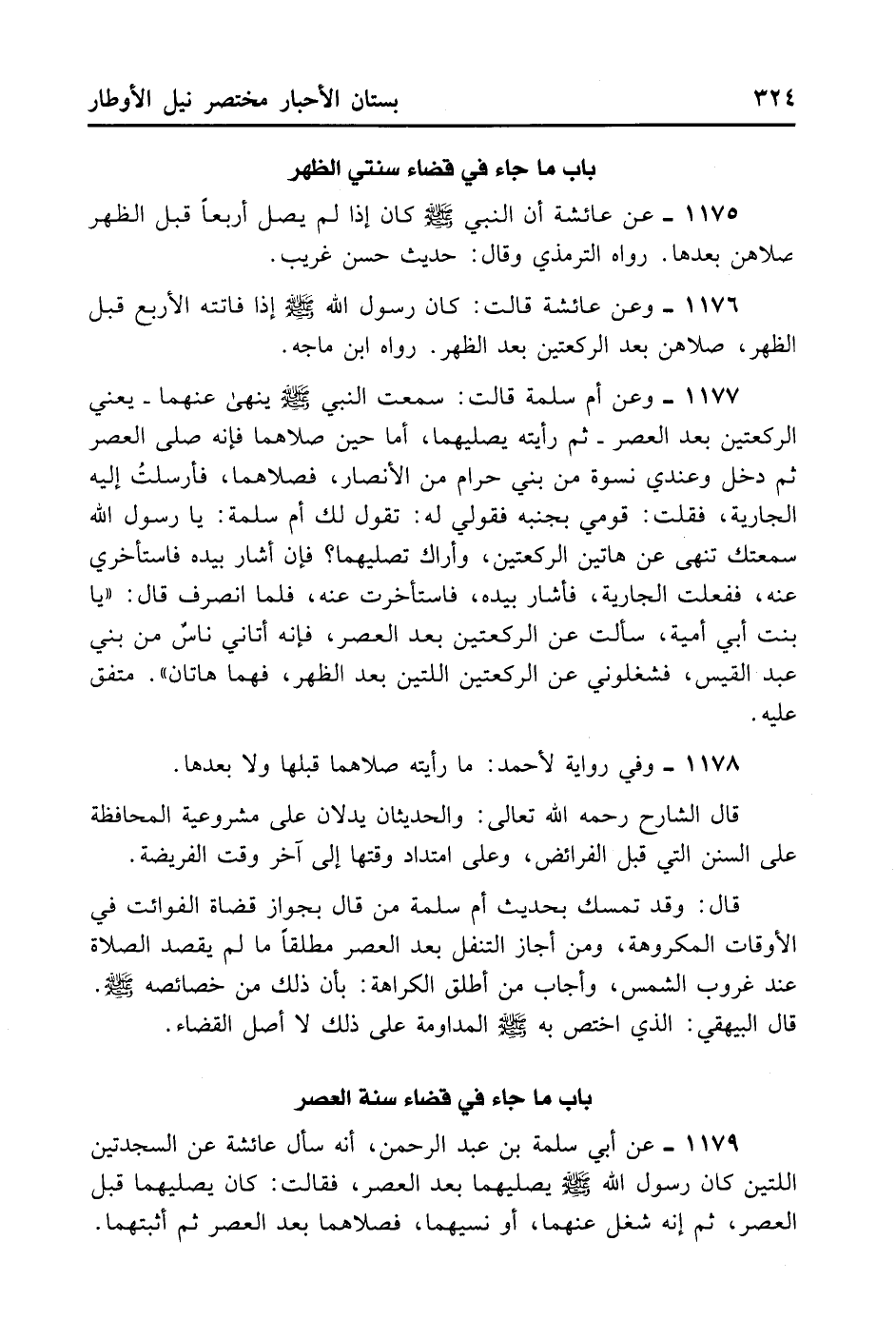 1177- وَعَنْ أُمِّ سَلَمَةَ قَالَتْ: سَمِعْتُ النَّبِيَّ - صلى الله عليه وسلم - يَنْهَى عَنْهُمَا تَعْنِي الرَّكْعَتَيْنِ بَعْدَ الْعَصْرِ، ثُمَّ رَأَيْتُهُ يُصَلِّيهِمَا. أَمَّا حِينَ صَلَّاهُمَا، فَإِنَّهُ صَلَّى الْعَصْرَ، ثُمَّ دَخَلَ وَعِنْدِي نِسْوَةٌ مِنْ بَنِي حَرَامٍ مِنْ الْأَنْصَارِ فَصَلَّاهُمَا، فَأَرْسَلْتُ إلَيْهِ الْجَارِيَةَ، فَقُلْتُ: قُومِي بِجَنْبِهِ فَقُولِي لَهُ: تَقُولُ لَكَ أُمُّ سَلَمَةَ: يَا رَسُولَ اللَّهِ