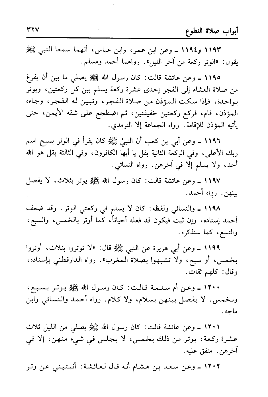 1198- وَالنَّسَائِيُّ وَلَفْظُهُ: كَانَ لَا يُسَلِّمُ فِي رَكْعَتَيْ الْوِتْرِ. وَقَدْ ضَعَّفَ أَحْمَدُ إسْنَادَهُ، وَإِنْ ثَبَتَ فَيَكُونُ قَدْ فَعَلَهُ أَحْيَانًا كَمَا أَوْتَرَ بِالْخَمْسِ وَالسَّبْعِ وَالتِّسْعِ كَمَا سَنَذْكُرُهُ.