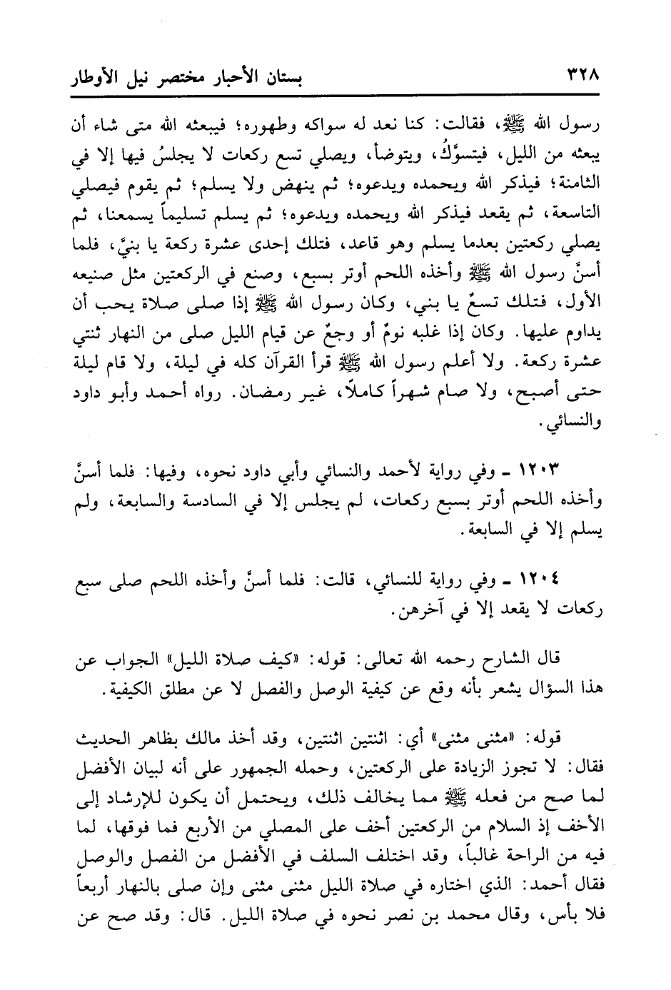 1203- وَفِي رِوَايَةٍ لِأَحْمَدَ وَالنَّسَائِيُّ وَأَبِي دَاوُد نَحْوُهُ، وَفِيهَا: فَلَمَّا أَسَنَّ وَأَخَذَهُ اللَّحْمُ أَوْتَرَ بِسَبْعِ رَكَعَاتٍ لَمْ يَجْلِسْ إلَّا فِي السَّادِسَةِ وَالسَّابِعَةِ، وَلَمْ يُسَلِّمْ إلَّا فِي السَّابِعَةِ.