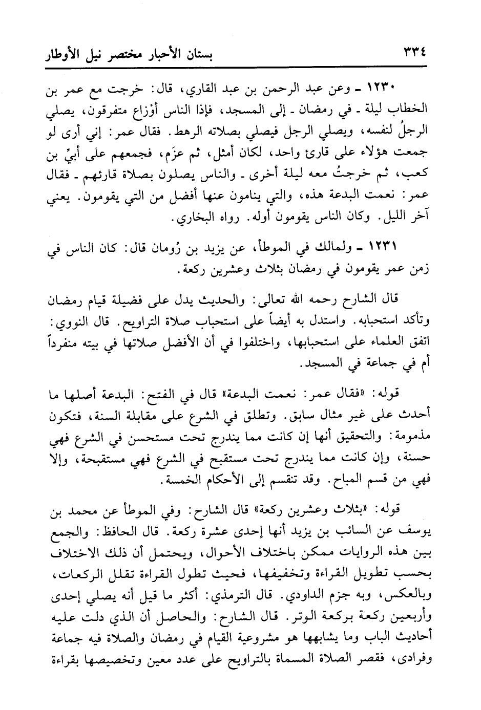 1231- وَلِمَالِكٍ فِي الْمُوَطَّأ عَنْ يَزِيدَ بْنِ رُومَانٍ قَالَ: كَانَ النَّاسُ فِي زَمَنِ عُمَرَ يَقُومُونَ فِي رَمَضَانَ بِثَلَاثٍ وَعِشْرِينَ رَكْعَةً) .