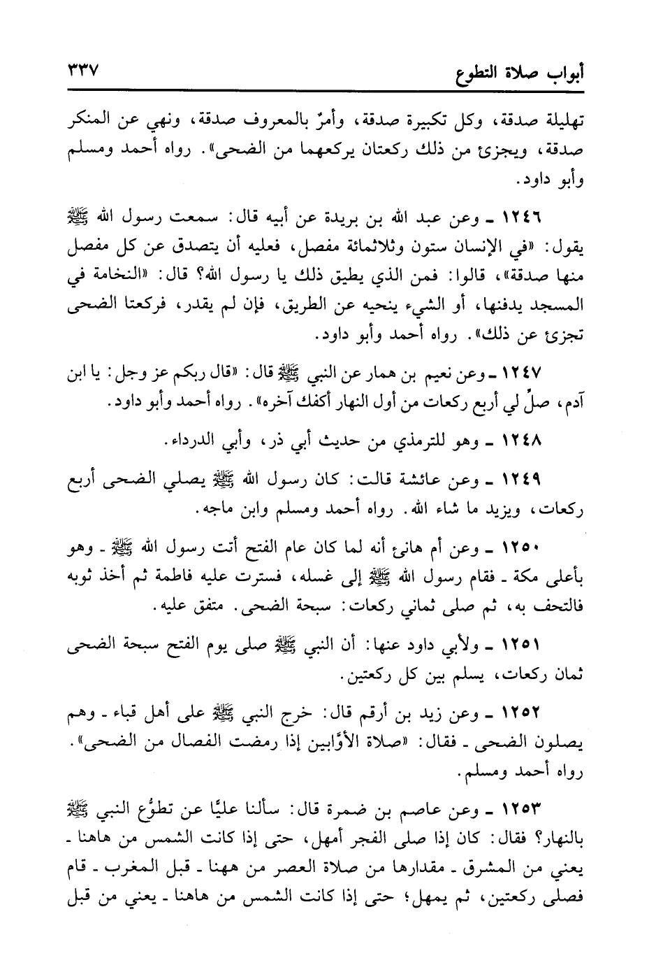 1246- وَعَنْ عَبْدِ اللَّهِ بْنِ بُرَيْدَةَ عَنْ أَبِيهِ قَالَ: سَمِعْتُ رَسُولَ اللَّهِ - صلى الله عليه وسلم - يَقُولُ: «فِي الْإِنْسَانِ سِتُّونَ وَثَلَاثُمِائَةِ مَفْصِلٍ، فَعَلَيْهِ أَنْ يَتَصَدَّقَ عَنْ كُلِّ مَفْصِلٍ مِنْهَا صَدَقَةً» . قَالُوا: فَمَنْ الَّذِي يُطِيقُ ذَلِكَ يَا رَسُولَ اللَّهِ؟ قَالَ: «النُّخَامَةُ فِي الْمَسْجِدِ يَدْفِنُهَا، أَوْ الشَّيْءُ يُنَحِّيهِ عَنْ الطَّرِيقِ، فَإِنْ لَمْ يَقْدِرْ فَرَكْعَتَا الضُّحَى تُجْزِئ عَنْكَ» . رَوَاهُ أَحْمَدُ وَأَبُو دَاوُد.