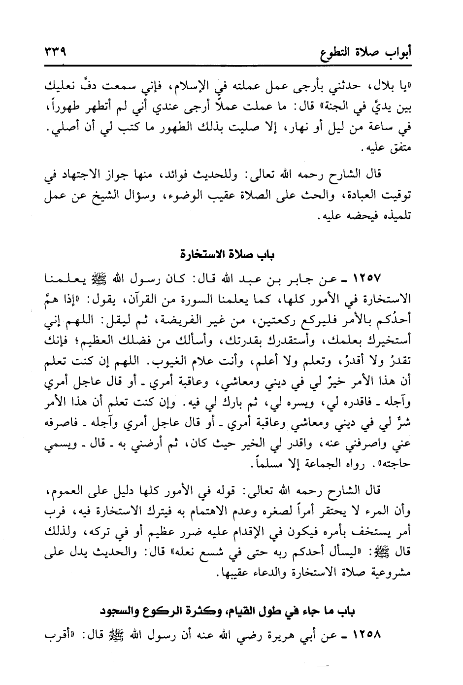 1257- عَنْ جَابِرِ بْنِ عَبْدِ اللَّهِ قَالَ: كَانَ رَسُولُ اللَّهِ - صلى الله عليه وسلم - يُعَلِّمُنَا الِاسْتِخَارَةَ فِي الْأُمُورِ كُلِّهَا كَمَا يُعَلِّمُنَا السُّورَةَ مِنْ الْقُرْآنِ، يَقُولُ: «إذَا هَمَّ أَحَدُكُمْ بِالْأَمْرِ فَلْيَرْكَعْ رَكْعَتَيْنِ مِنْ غَيْرِ الْفَرِيضَةِ ثُمَّ لِيَقُلْ: اللَّهُمَّ إنِّي أَسْتَخِيرُكَ بِعِلْمِكَ، وَأَسْتَقْدِرُكَ بِقْدْرَتِكَ، وَأَسْأَلُكَ مِنْ فَضْلِكَ الْعَظِيمِ، فَإِنَّكَ تَقْدِرُ وَلَا أَقْدِرُ، وَتَعْلَمُ وَلَا أَعْلَمُ، وَأَنْتَ عَلَّامُ الْغُيُوبِ، اللَّهُمَّ إنْ كُنْتَ تَعْلَمُ أَنَّ هَذَا الْأَمْرَ خَيْرٌ لِي فِي دِينِي وَمَعَاشِي وَعَاقِبَةِ أَمْرِي، أَوْ قَالَ: عَاجِلِ أَمْرِي وَآجِلِهِ فَاقْدُرْهُ لِي وَيَسِّرْهُ لِي ثُمَّ بَارِكْ لِي فِيهِ، وَإِنْ كُنْتَ تَعْلَمُ أَنَّ هَذَا الْأَمْرَ شَرٌّ لِي فِي دِينِي وَمَعَاشِي وَعَاقِبَةِ أَمْرِي» . أَوْ قَالَ: «عَاجِلِ أَمْرِي وَآجِلِهِ فَاصْرِفْهُ عَنِّي، وَاصْرِفْنِي عَنْهُ، وَاقْدُرْ لِي الْخَيْرَ حَيْثُ كَانَ ثُمَّ أَرْضِنِي بِهِ» . قَالَ: «وَيُسَمِّي حَاجَتَهُ» . رَوَاهُ الْجَمَاعَةُ إلَّا مُسْلِمًا.