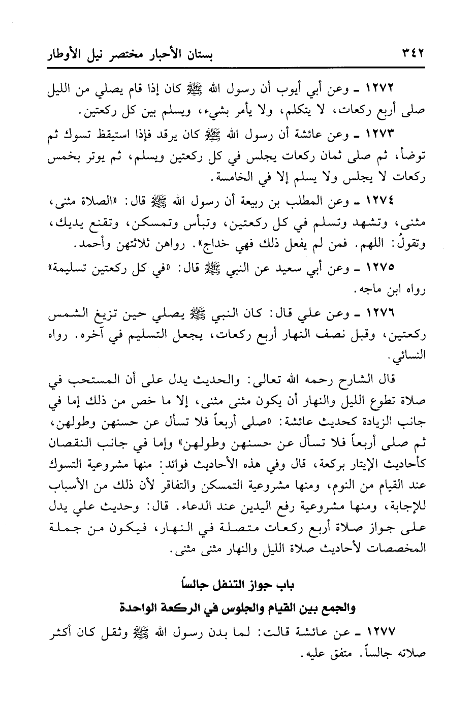 1272- وَعَنْ أَبِي أَيُّوبَ أَنَّ رَسُولَ اللَّهِ - صلى الله عليه وسلم - كَانَ إذَا قَامَ يُصَلِّي مِنْ اللَّيْلِ، صَلَّى أَرْبَعَ رَكَعَاتٍ لَا يَتَكَلَّمُ وَلَا يَأْمُرُ بِشَيْءٍ، وَيُسَلِّمُ بَيْنَ كُلِّ رَكْعَتَيْنِ.