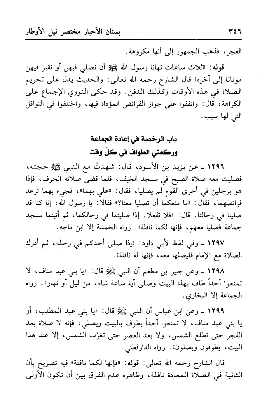 1299- وَعَنْ ابْنِ عَبَّاسٍ أَنَّ النَّبِيّ - صلى الله عليه وسلم - قَالَ: «يَا بَنِي عَبْدِ الْمُطَّلِبِ، أَوْ يَا بَنِي عَبْدَ مَنَافٍ لَا تَمْنَعُوا أَحَدًا يَطُوفُ بِالْبَيْتِ وَيُصَلِّي، فَإِنَّهُ لَا صَلَاةَ بَعْدَ الْفَجْرِ