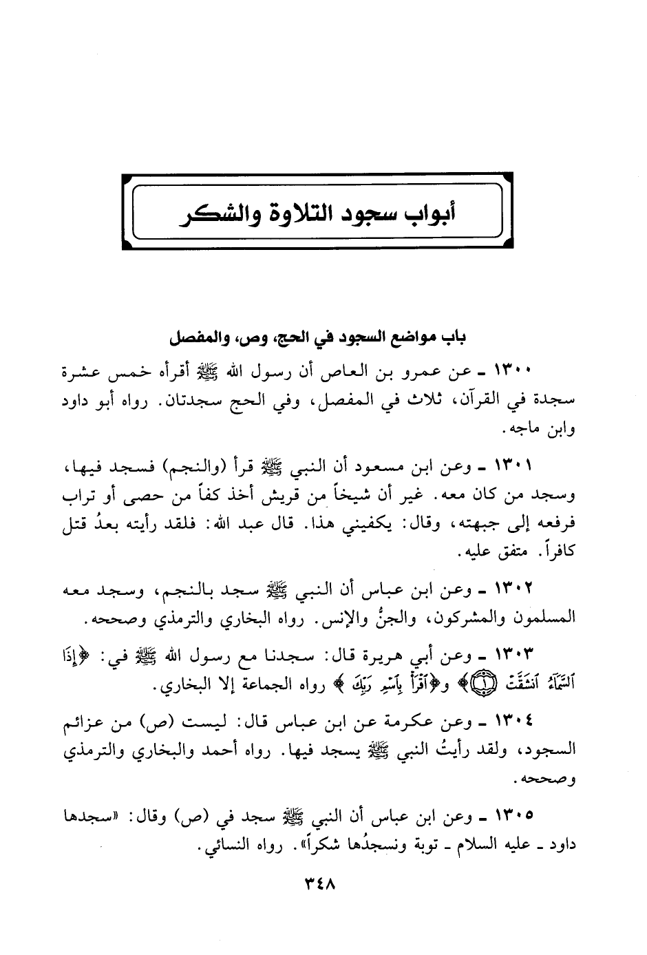 1300- عَنْ عَمْرِو بْنِ الْعَاصِ أَنَّ رَسُولَ اللَّهِ - صلى الله عليه وسلم - أَقَرَأَهُ خَمْسَ عَشْرَةَ سَجْدَةً فِي الْقُرْآنِ، مِنْهَا ثَلَاثٌ فِي الْمُفَصَّلِ وَفِي الْحَجِّ سَجْدَتَانِ. رَوَاهُ أَبُو دَاوُد وَابْنُ مَاجَهْ.