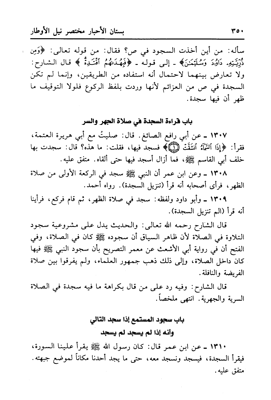 1310- عَنْ ابْنِ عُمَرَ قَالَ: كَانَ رَسُولُ اللَّهِ - صلى الله عليه وسلم - يَقْرَأُ عَلَيْنَا السُّورَةَ فَيَقْرَأُ السَّجْدَةَ فَيَسْجُدُ وَنَسْجُدُ مَعَهُ حَتَّى مَا يَجِدُ أَحَدُنَا مَكَانًا لِمَوْضِعِ جَبْهَتِهِ. مُتَّفَقٌ عَلَيْهِ.