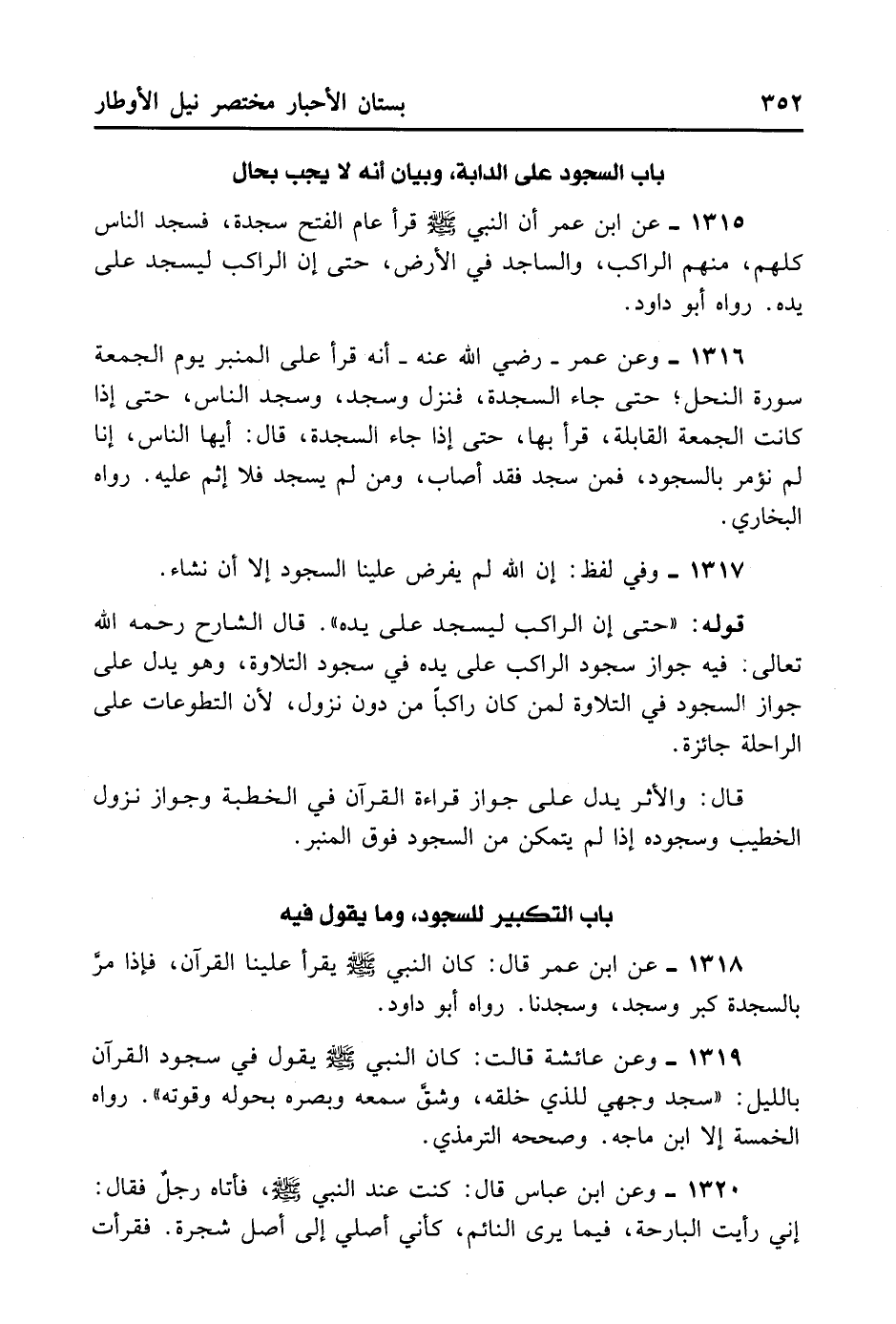 1315- عَنْ ابْنِ عُمَرَ أَنَّ النَّبِيَّ - صلى الله عليه وسلم - قَرَأَ عَامَ الْفَتْحِ سَجْدَةً فَسَجَدَ النَّاسُ كُلُّهُمْ مِنْهُمْ الرَّاكِبُ وَالسَّاجِدُ فِي الْأَرْضِ، حَتَّى إنَّ الرَّاكِبَ لَيَسْجُدُ عَلَى يَدِهِ. رَوَاهُ أَبُو دَاوُد.