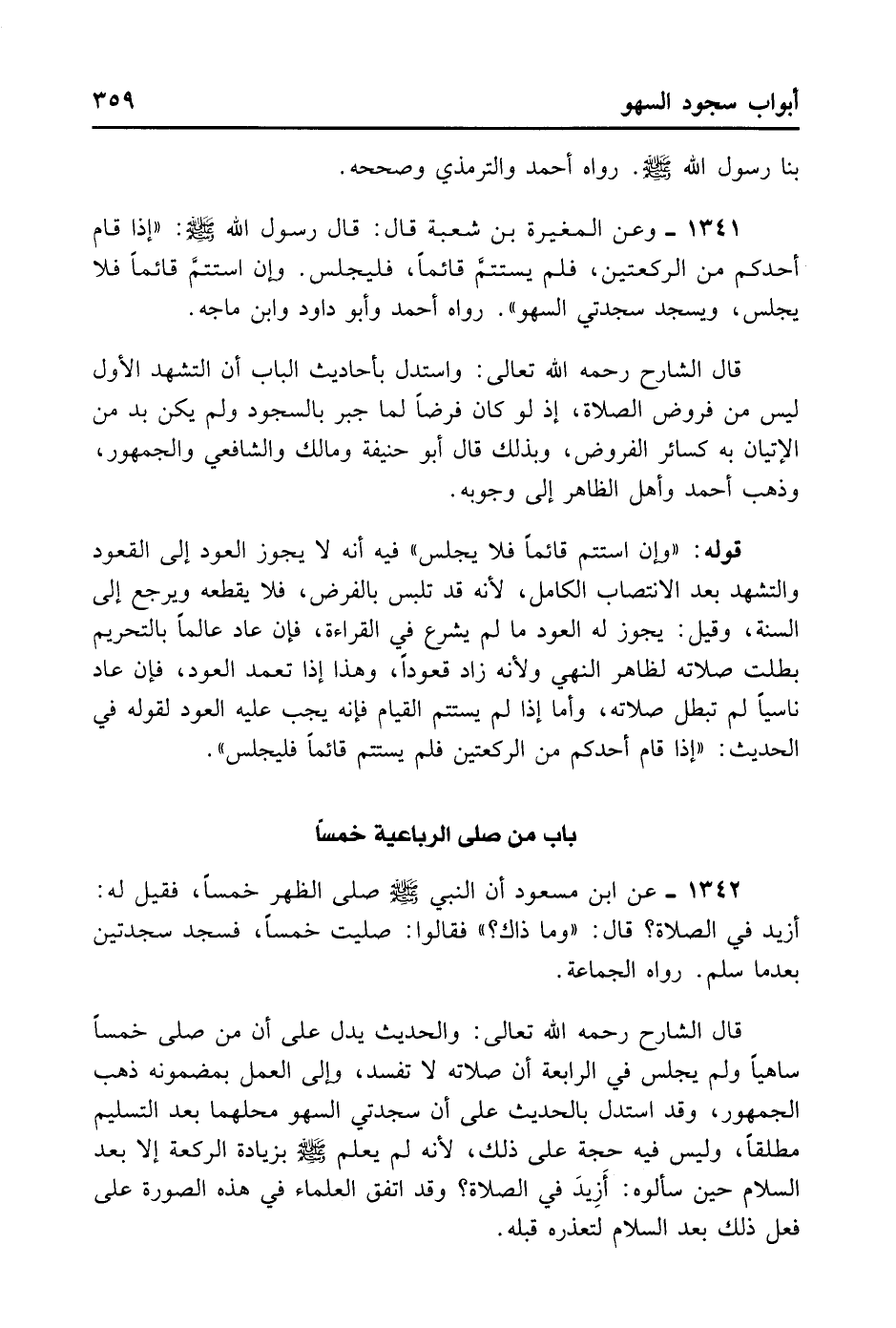 1342- عَنْ ابْنِ مَسْعُودٍ أَنَّ النَّبِيَّ - صلى الله عليه وسلم - صَلَّى الظُّهْرَ خَمْسًا فَقِيلَ لَهُ: أَزِيدَ فِي الصَّلَاةِ؟ قَالَ: «وَمَا ذَاكَ» ؟ قَالُوا: صَلَّيْتَ خَمْسًا، فَسَجَدَ سَجْدَتَيْنِ بَعْدَ مَا سَلَّمَ. رَوَاهُ الْجَمَاعَةُ.